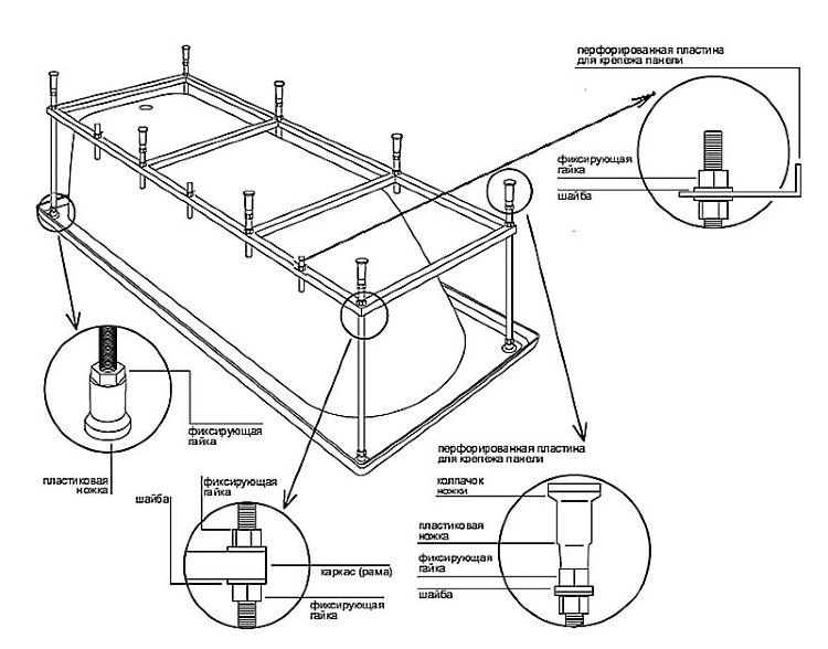 Для регулировки ванны по высоте и уровню в комплект входят пластиковые ножки.