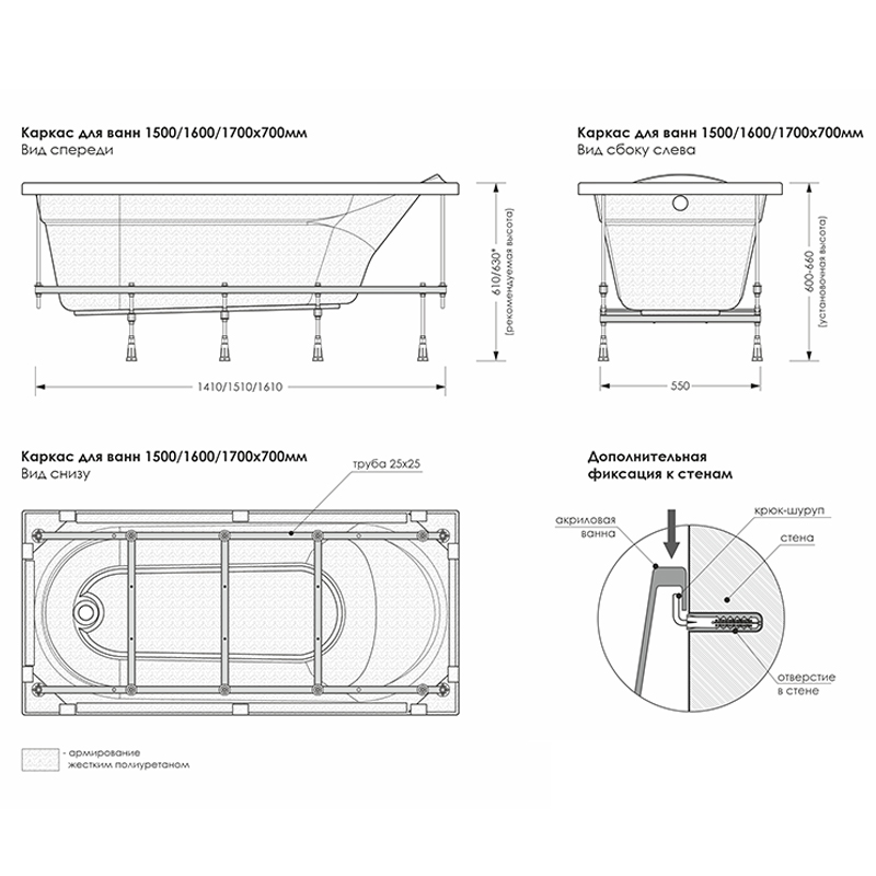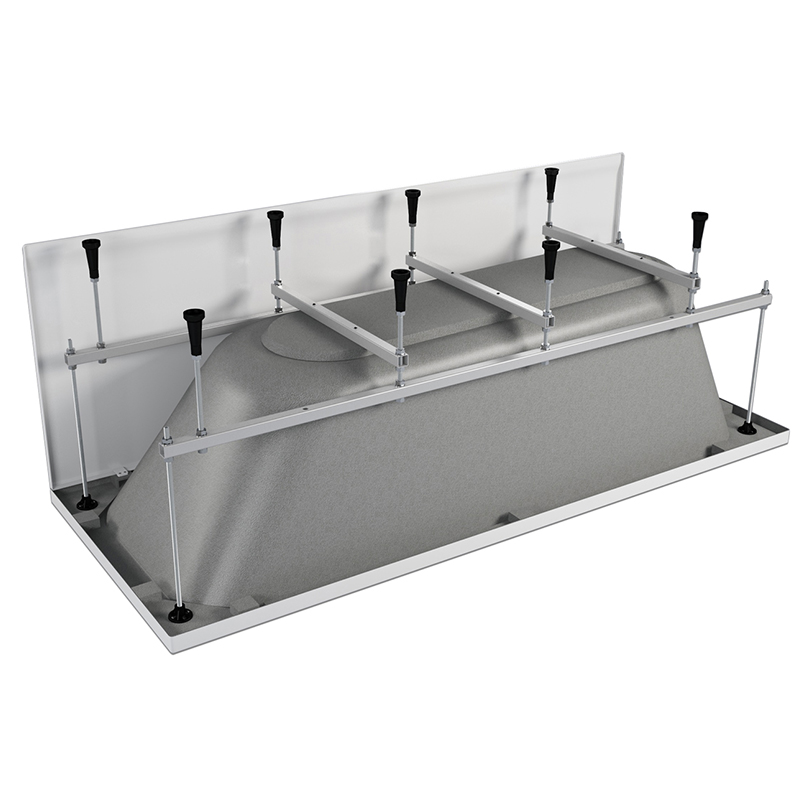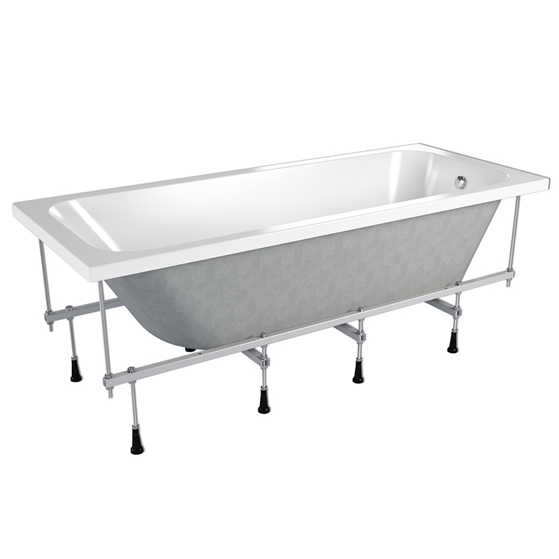 Сборно-разборный каркас изготовлен из стали толщиной 1,5 мм с полимерным окрашиванием. Распределение нагрузки на 8 опор, что обеспечивает устойчивость изделию и безопасность использования. Ножки изготовлены из металлических шпилек М10 с пластиковыми опорами. Регулирование высоты ножек - до 60 мм. Максимальная нагрузка на дно ванны при установки на каркас 500 кг