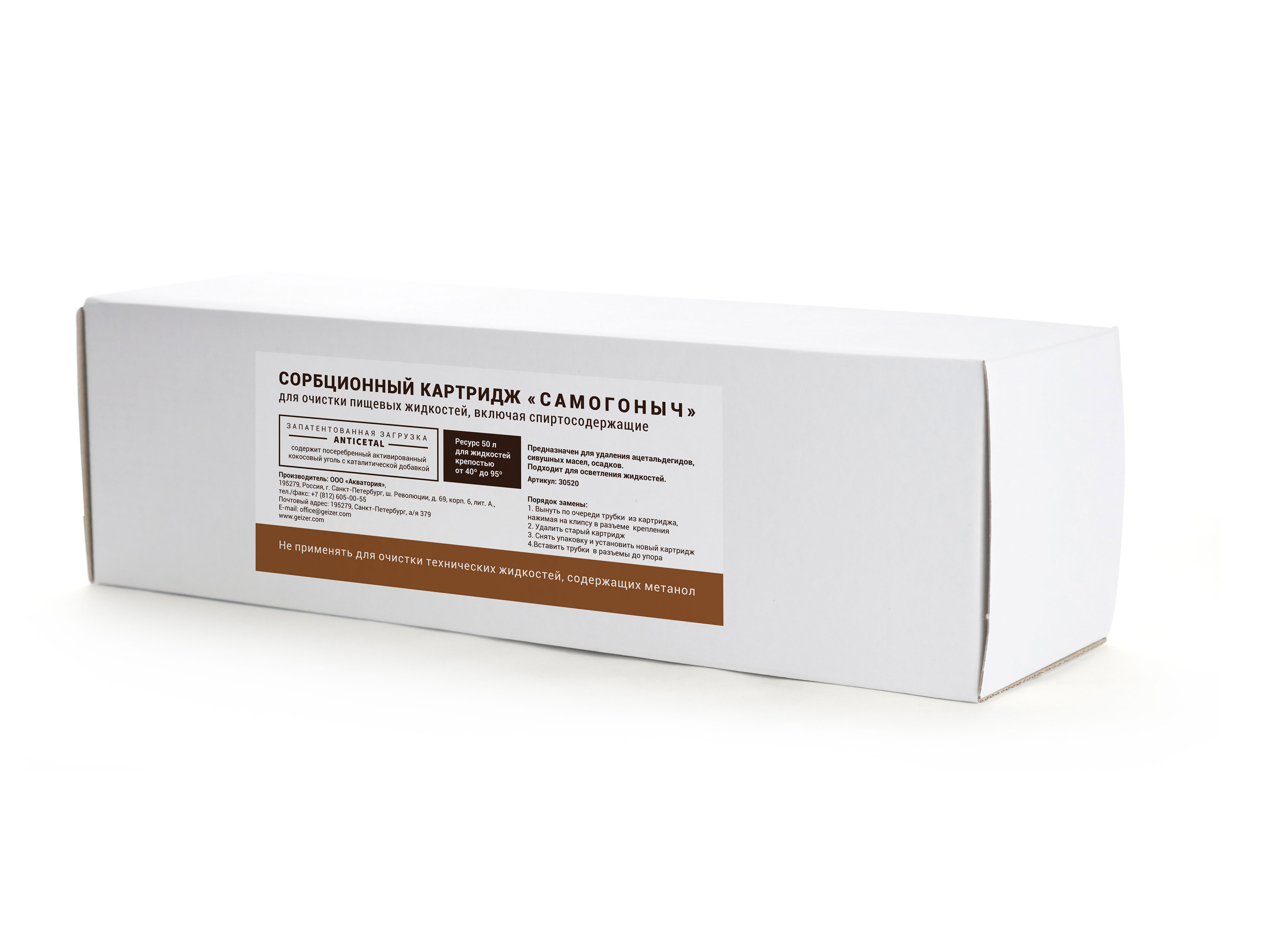 Картридж предназначен для использования в фильтре Гейзер Самогоныч. Специально разработан для очистки пищевых жидкостей, в том числе спиртосодержащих: водки, самогона. Надежно удаляет сивушные масла и альдегиды. Это улучшает вкусовые качества покупных и приготовленных в домашних условиях спиртных напитков. Для фильтрации используется каталитический материал «Антицеталь».