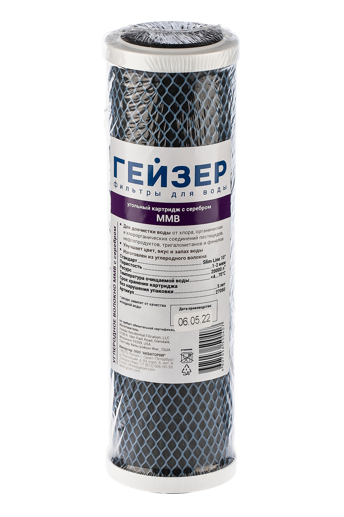 Картридж ММВ используется в фильтрах Гейзер комплектации Элита. Этот картридж изготовлен из углеродного волокна с большой поверхностью поглощения. Благодаря этому имеют высокую эффективность по удалению органических и хлорорганических соединений и рес