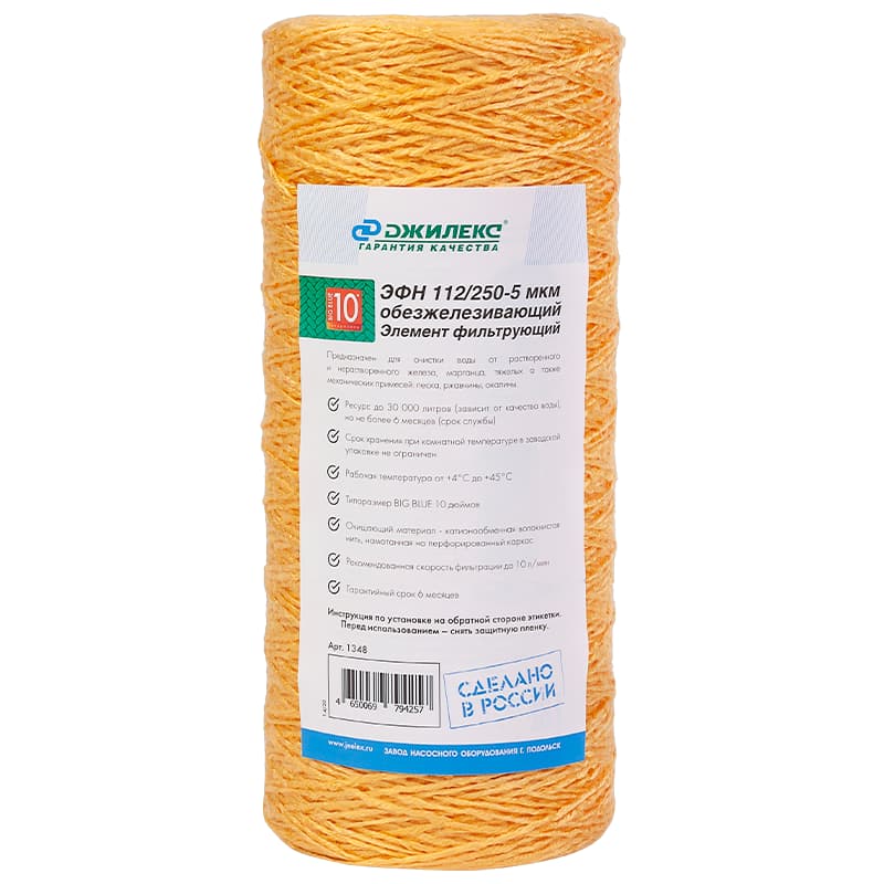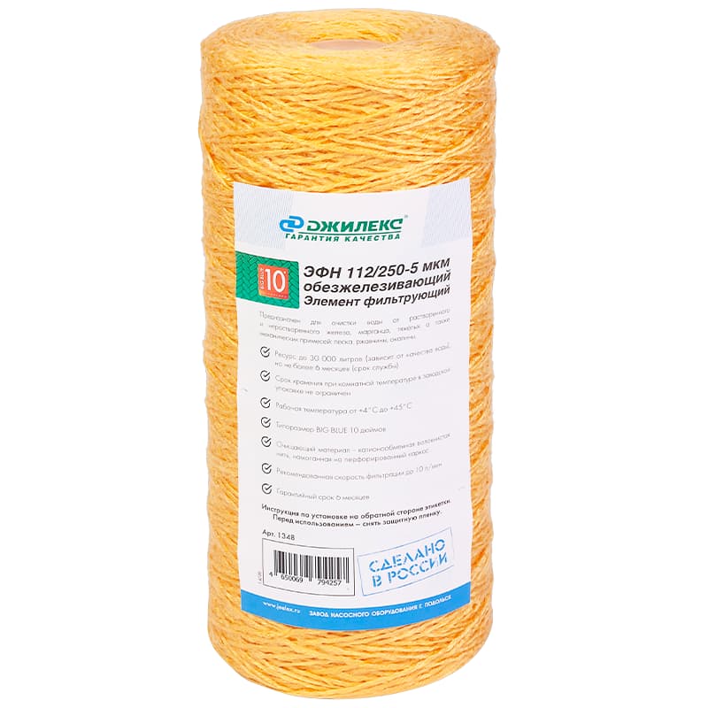 Фильтрующий элемент для удаления железа из воды Джилекс ЭФН 112/250- 5 мкм обезжелезивающий (10 ББ) с типоразмером BIG BLUE 10"" , арт. 1348 — удаляет активный хлор, соли жесткости, железо и тяжелые металлы. Типоразмер: BIG BLUE 10 дюймов. Ресурс до 6000 л.
