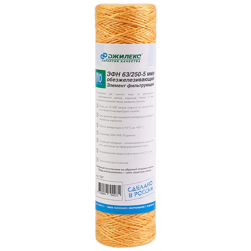 Фильтрующий элемент для удаления железа из воды Джилекс ЭФН 63/250-5 мкм обезжелезивающий с типоразмером SLIM LINE 10"", арт. 1347 — удаляет активный хлор, соли жесткости, железо и тяжелые металлы. Типоразмер: SLIM LINE 10 дюймов. Ресурс до 3000 л.