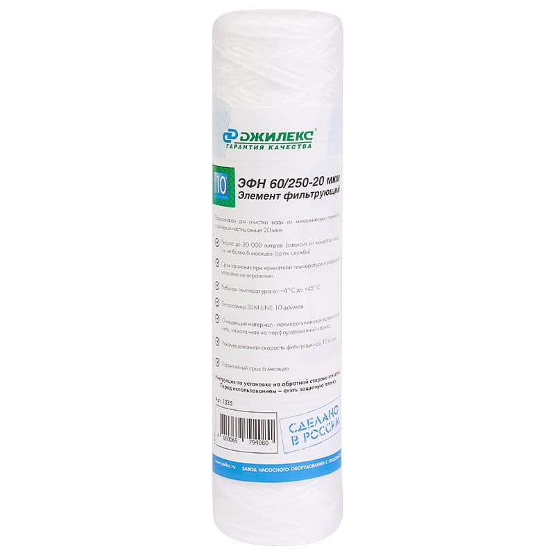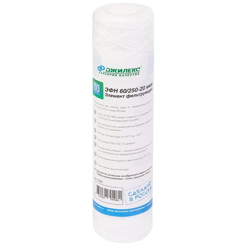 Фильтрующий элемент для механической очистки воды Джилекс ЭФН 60/250-20мкм с типоразмером SLIM LINE 10"", арт. 1335 — сделан из веревочного полипропилена, намотанного на стержень. Типоразмер: SLIM LINE 10 дюймов. Ресурс до 10000 л.