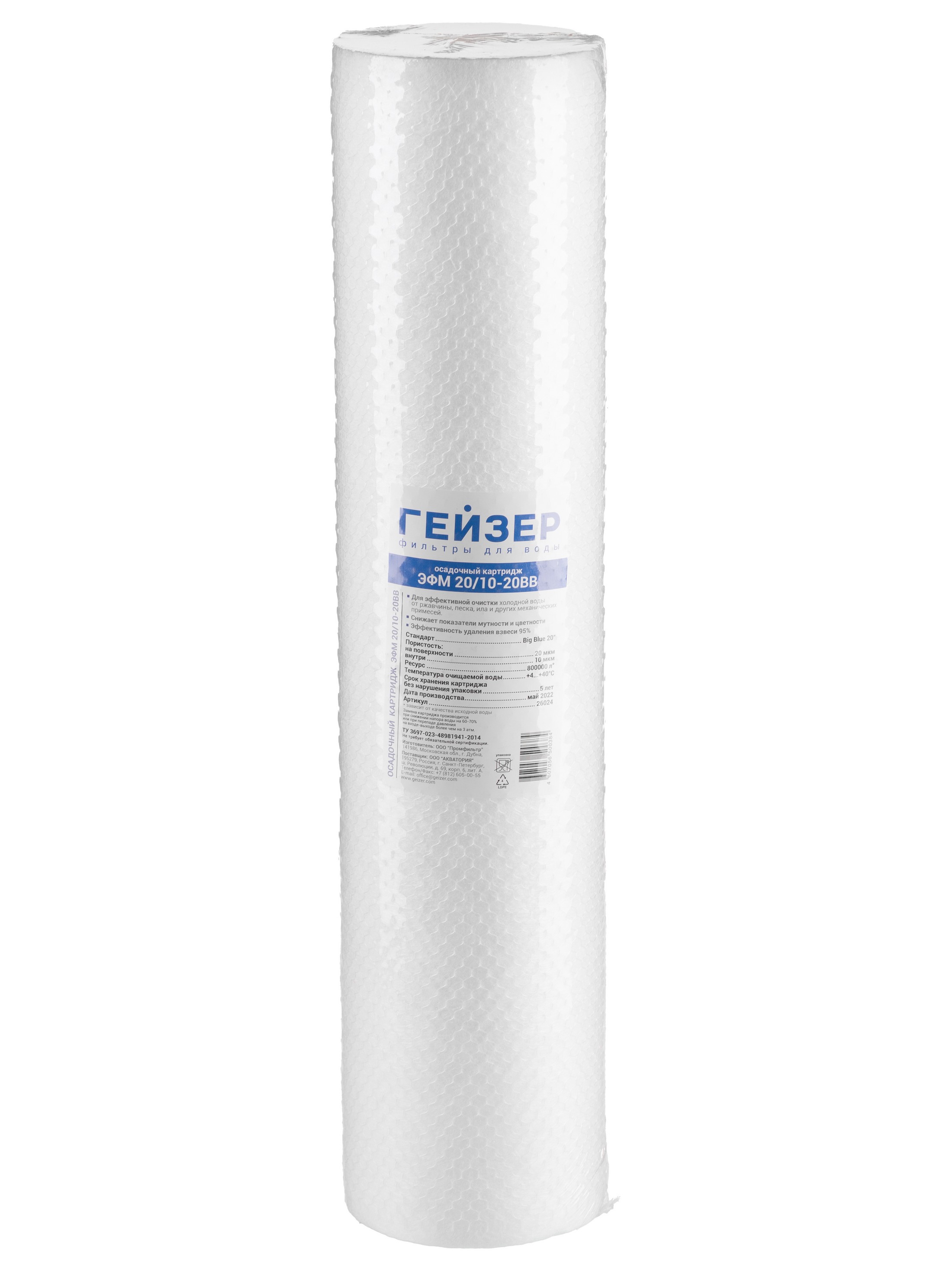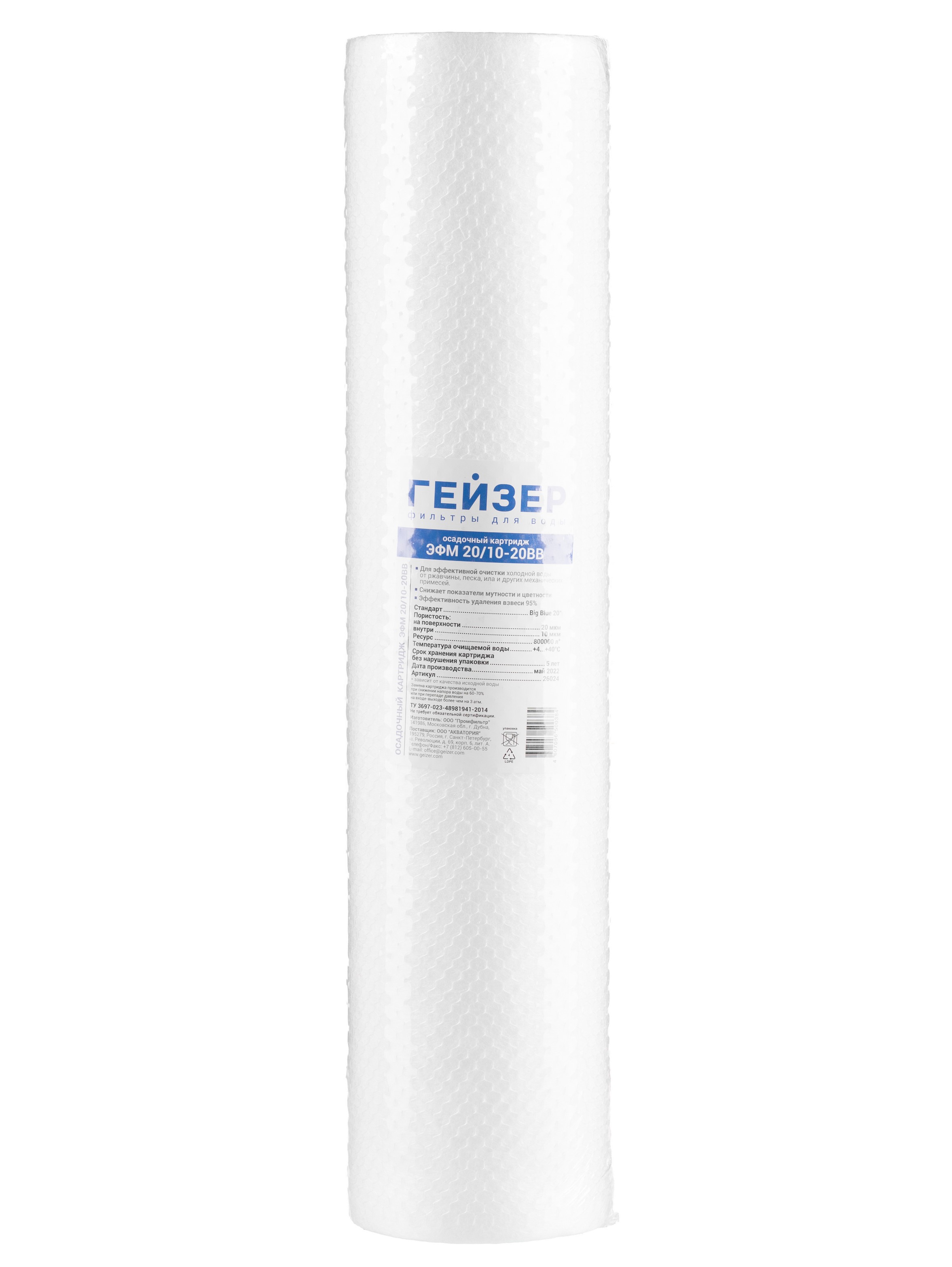 Картридж Гейзер ЭФМ 20/10 - 20ВВ (вспененный полипропилен, для холодной воды) (26024)