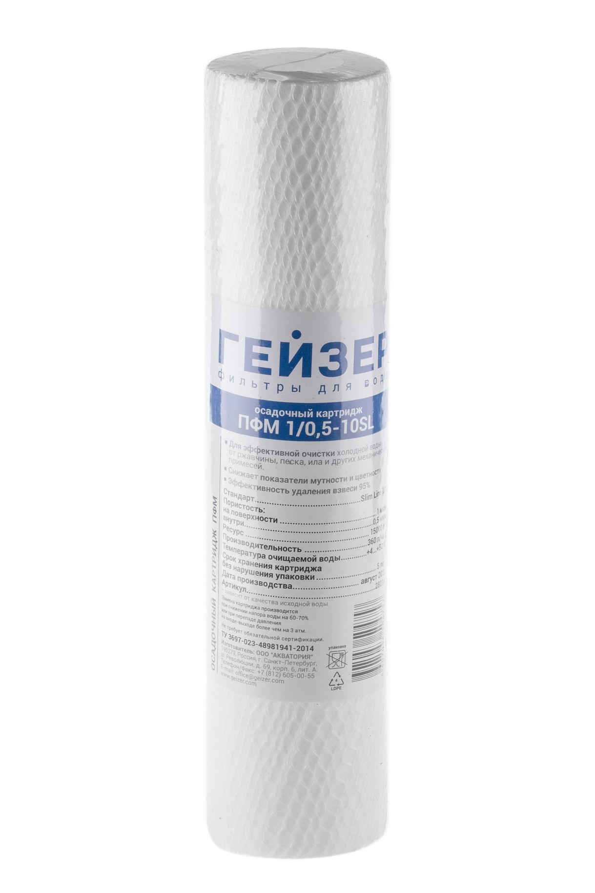 Картридж ПФМ 1/0,5 - 10SL изготовлен из вспененного полипропилена. Имеет градиентную пористость: диаметр поры уменьшается при движении воды внутрь картриджа, благодаря чему работает весь объем фильтрующего материала.