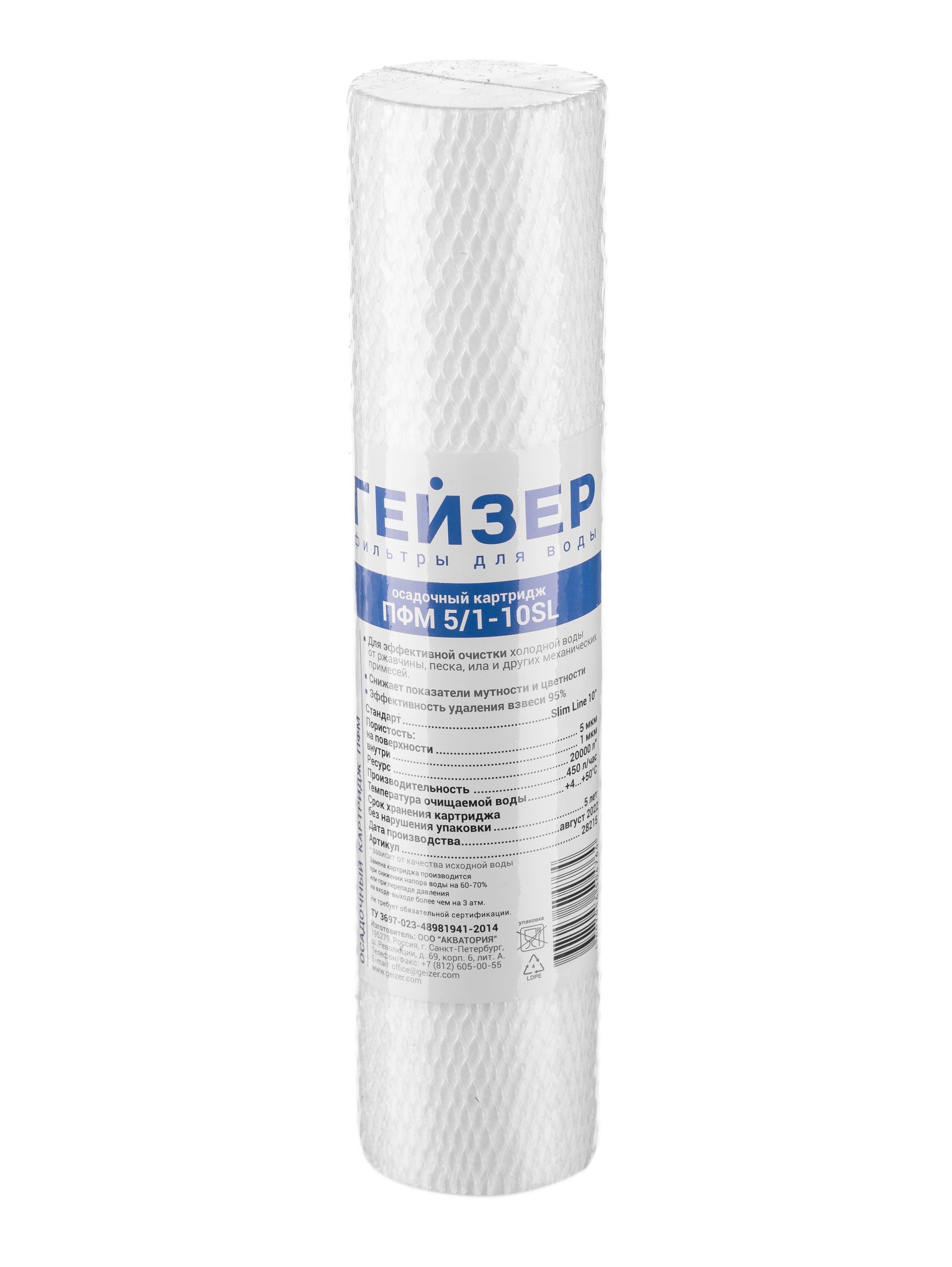 Картридж ПФМ 5/1 - 10SL изготовлен из вспененного полипропилена. Имеет градиентную пористость: диаметр поры уменьшается при движении воды внутрь картриджа, благодаря чему работает весь объем фильтрующего материала.