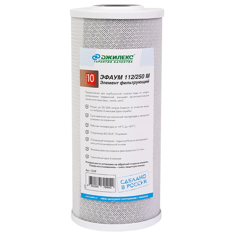 Фильтрующий элемент для сорбционной очистки воды Джилекс ЭФАУМ 112/250М (10 ББ) с типоразмером BIG BLUE 10"", арт. 1339 — картридж сорбционной очистки воды от хлора, органических соединений. Типоразмер: BIG BLUE 10 дюймов. Ресурс до 12000 л.