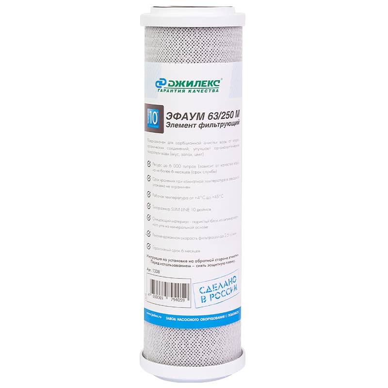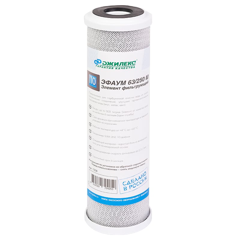 Фильтрующий элемент для сорбционной очистки воды Джилекс ЭФАУМ 63/250М с типоразмером SLIM LINE 10"", арт. 1338 — картридж сорбционной очистки воды от хлора, органических соединений. Типоразмер: SLIM LINE 10 дюймов. Ресурс до 4000 л.