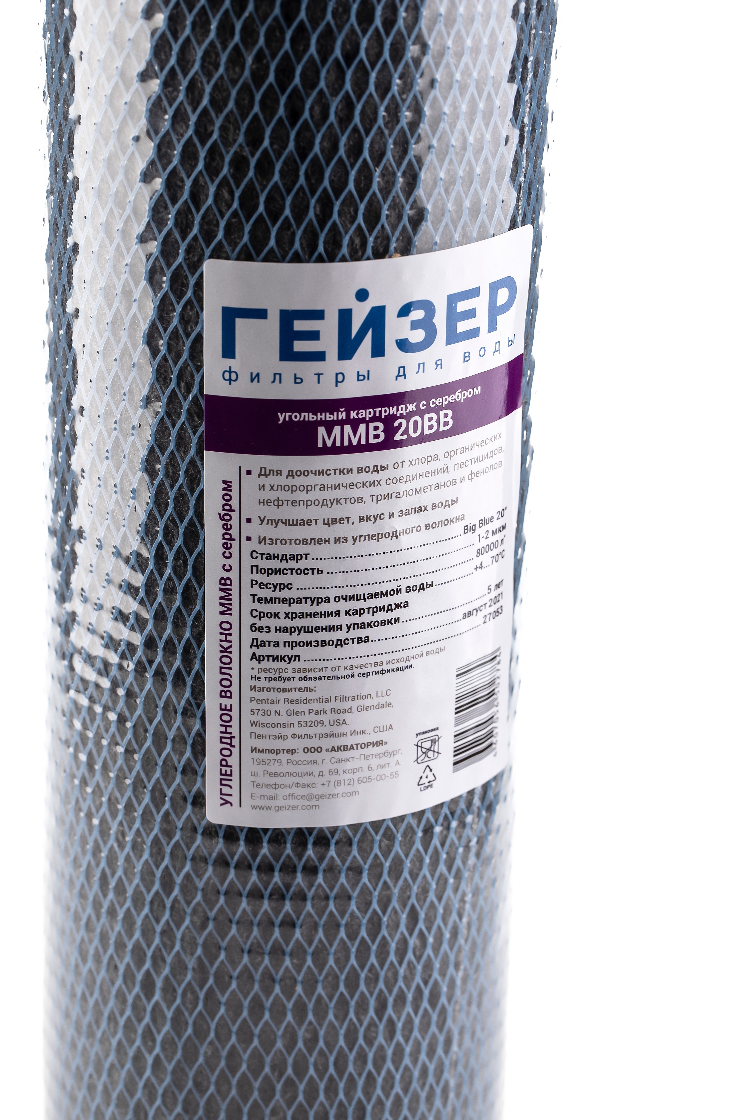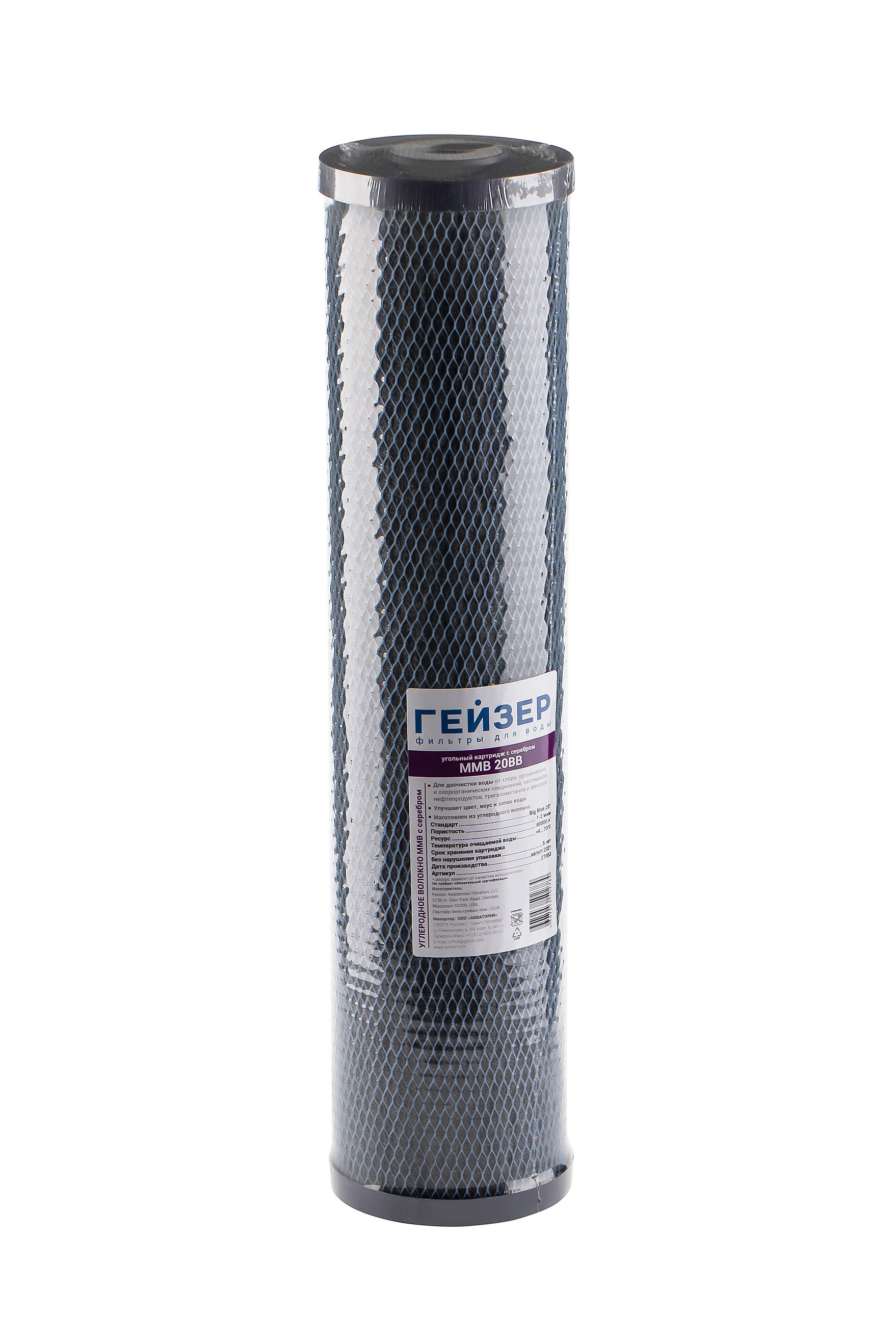 Картридж MMB - 20ВВ изготовлен из высококачественного углеродного волокна, обладающего большей поверхностью поглощения и повышенным ресурсом в сравнении с другими сорбентами. Эффективно очищает воду от свободного хлора, органических и хлорорганических соединений. Устраняет неприятные запахи и посторонний вкус. Добавка серебра обеспечивает бактериостатический эффект. Сертифицирован по европейскому стандарту EN 14476:2007.