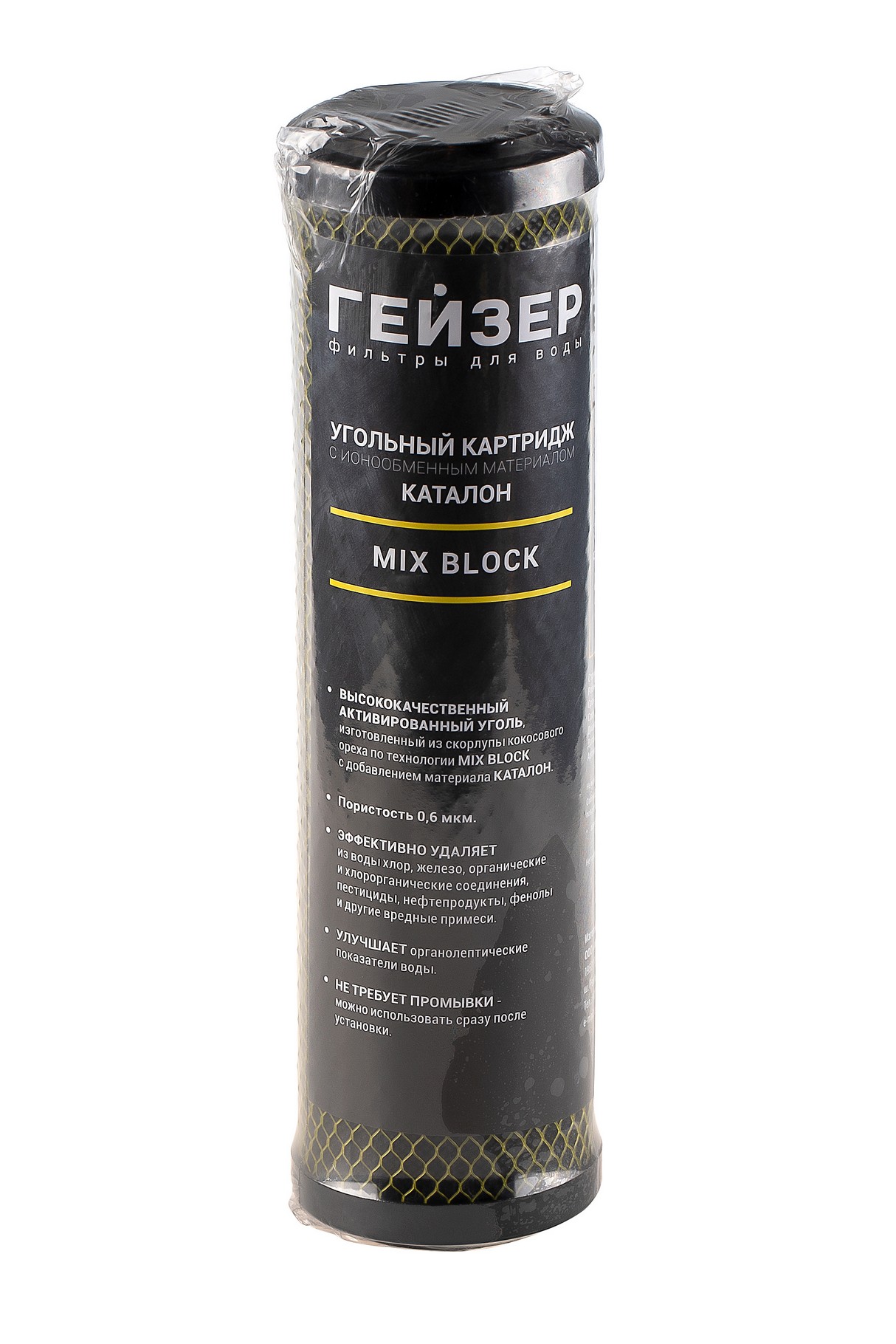 Картридж Гейзер Микс Блок (пористость – 0,6 мкм) применяется для финишной доочистки водопроводной воды в стационарных фильтрах стандарта Slim Line 10”. Эффективно удаляет из воды хлор, железо, органические и хлорорганические соединения, пестициды, нефтепродукты, фенолы и другие вредные примеси. Улучшает органолептические показатели воды – цвет, запах и вкус воды.