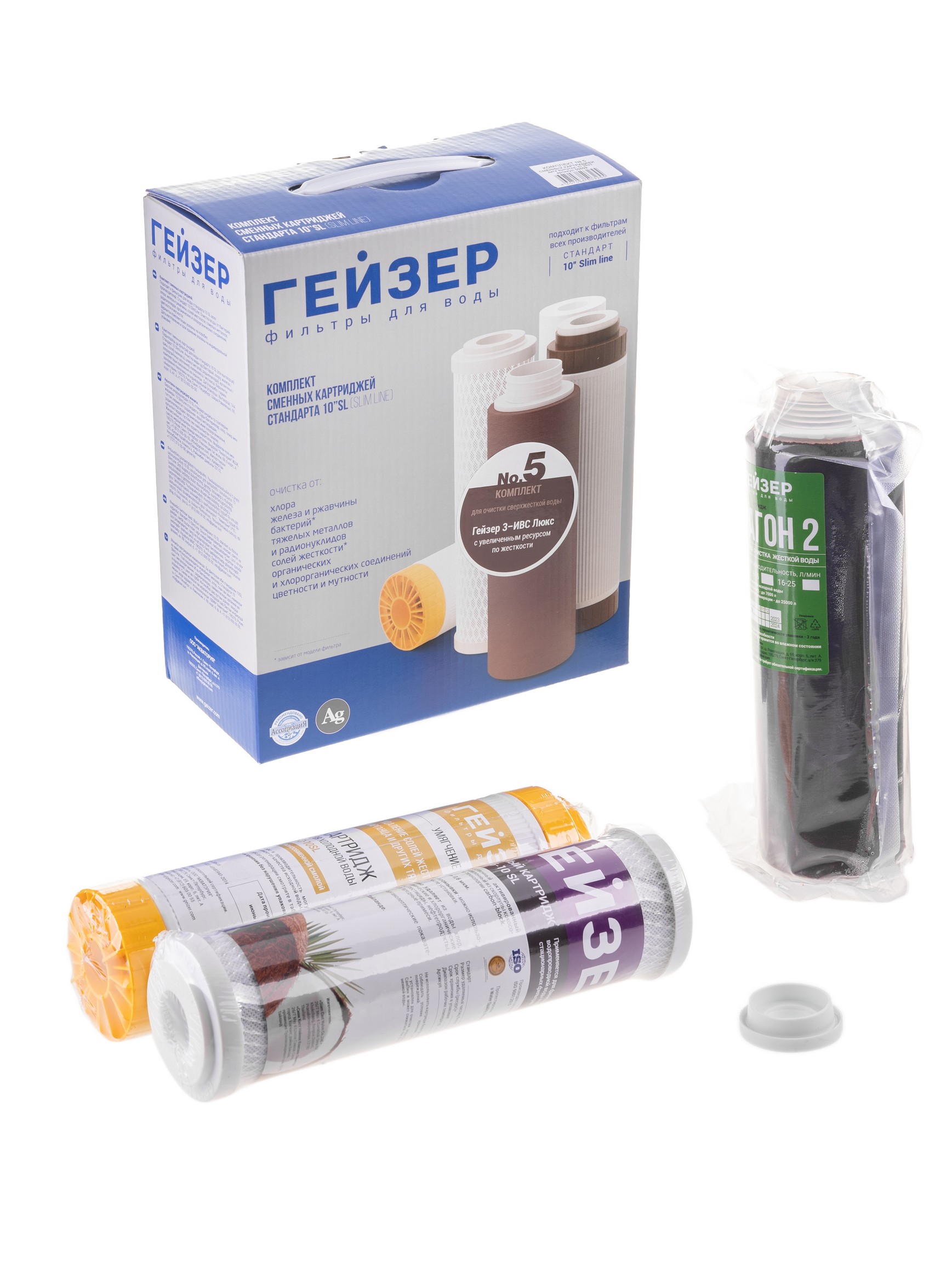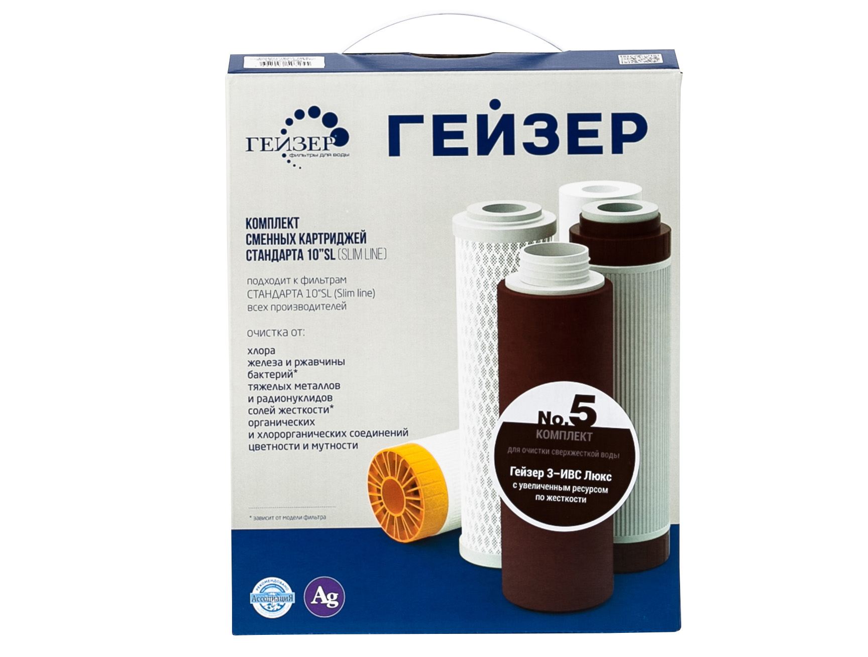 Комплект сменных картриджей №5 предназначен для фильтра Гейзер 3 ИВС Люкс (высокий уровень минерализации).