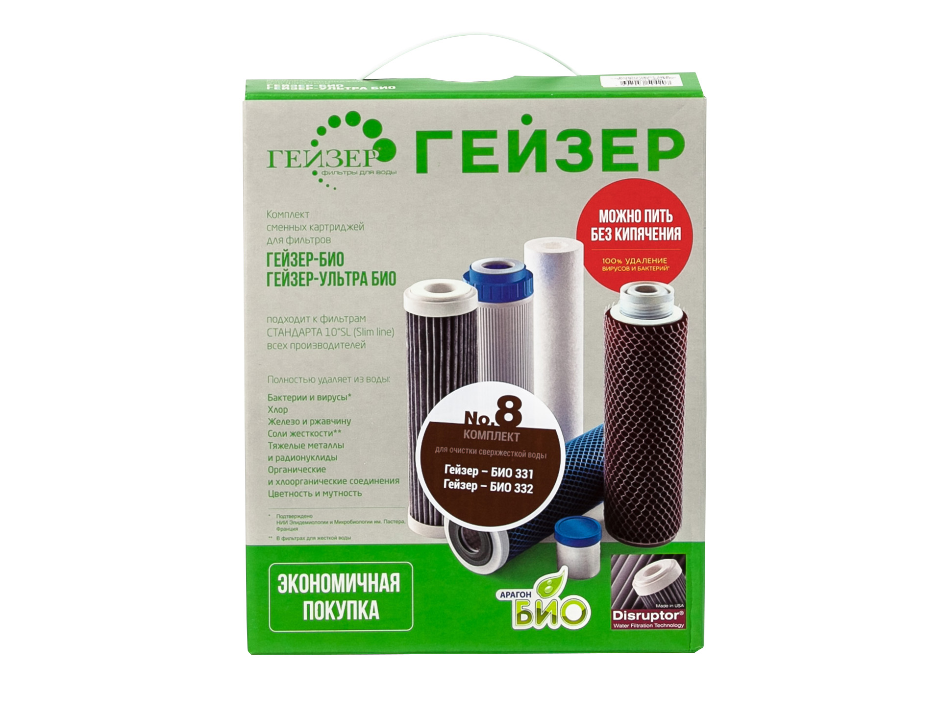 Комплект сменных картриджей №8 предназначен для фильтров Гейзер БИО 331 и Гейзер БИО 332 (воды с высоким содержанием солей).