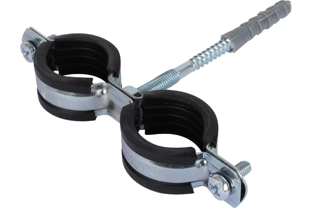 Двойной хомут для труб, комплект: хомут+шпилька шуруп +дюбель пластиковый
