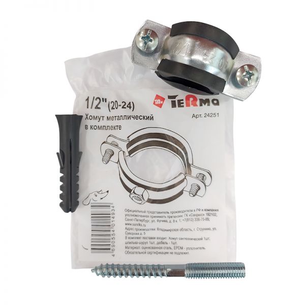 Хомут из оцинкованной стали с резин.уплотн. с гайкой, в комплекте со шпилькой-шурупом и дюбелем. Хомут применяется для крепления труб различного назначения. Трубные оцинкованные хомуты с шурупом и дюбелем торговой марки TeRma изготовлены из качественной оцинкованной стали, обеспечивают надежное крепление и имеют длительный срок службы. В качестве уплотнителя используется высококачественная резина EPDM, которая обеспечивает идеальную шумоизоляцию. Оцинкованные хомуты с шурупом и дюбелем имеют длительный срок службы, пригодны для многоразового использования.