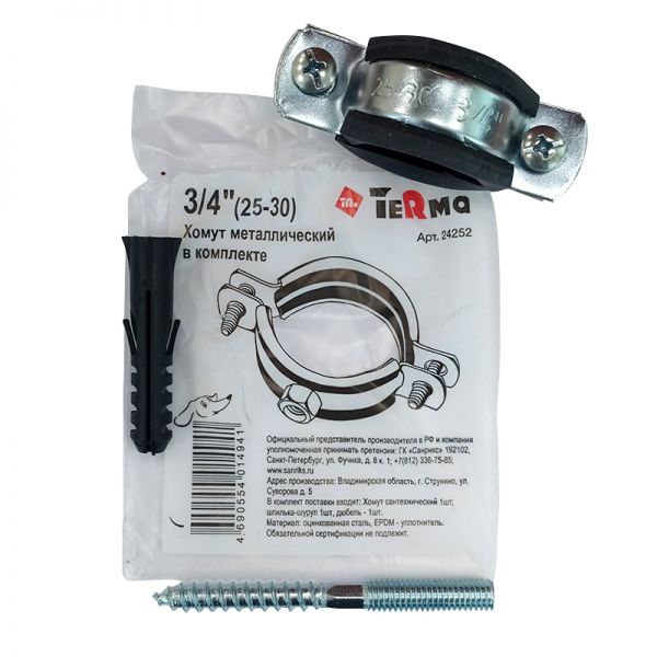 Хомут из оцинкованной стали с резин.уплотн. с гайкой, в комплекте со шпилькой-шурупом и дюбелем. Хомут применяется для крепления труб различного назначения. Трубные оцинкованные хомуты с шурупом и дюбелем торговой марки TeRma изготовлены из качественной оцинкованной стали, обеспечивают надежное крепление и имеют длительный срок службы. В качестве уплотнителя используется высококачественная резина EPDM, которая обеспечивает идеальную шумоизоляцию. Оцинкованные хомуты с шурупом и дюбелем имеют длительный срок службы, пригодны для многоразового использования.