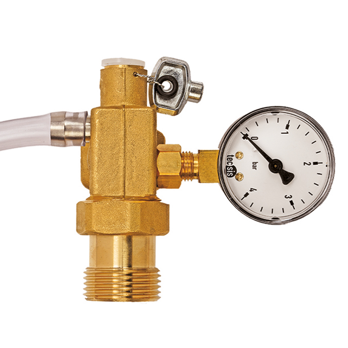 Прямой вентиль Meibes MAG позволяет подключать расширительный бак напрямую к системе отопления. Для замены расширительного бака с левого торца снимается заглушка и ключ и этим ключом откручивается шток. При такой замене отопительная система отсекается полностью от расширительного сосуда, а теплоноситель сливается из бак через сливной патрубок.