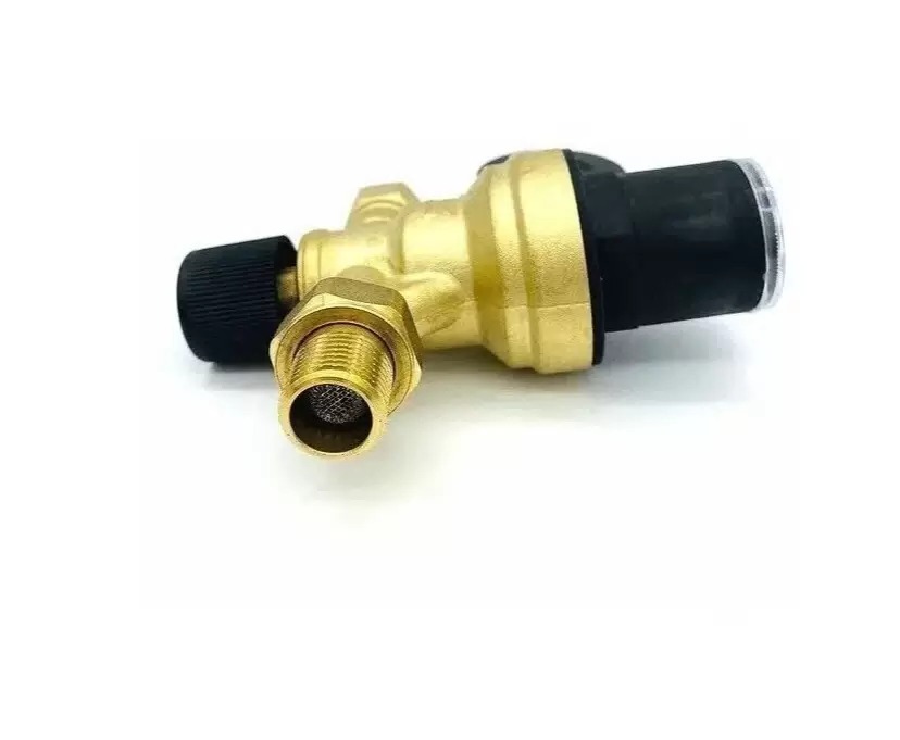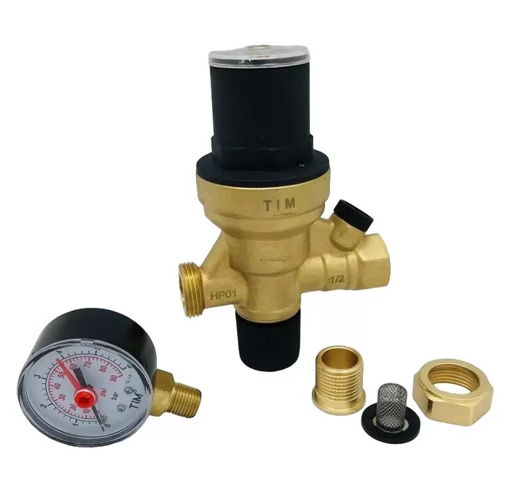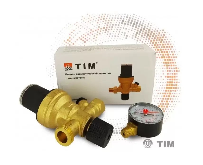 Клапан автоматической подпитки TIM с манометром 1/2"" состоит из редукционного клапана давления с компенсационным седлом, фильтром на входе, вентиля-отсекателя и обратного клапана.