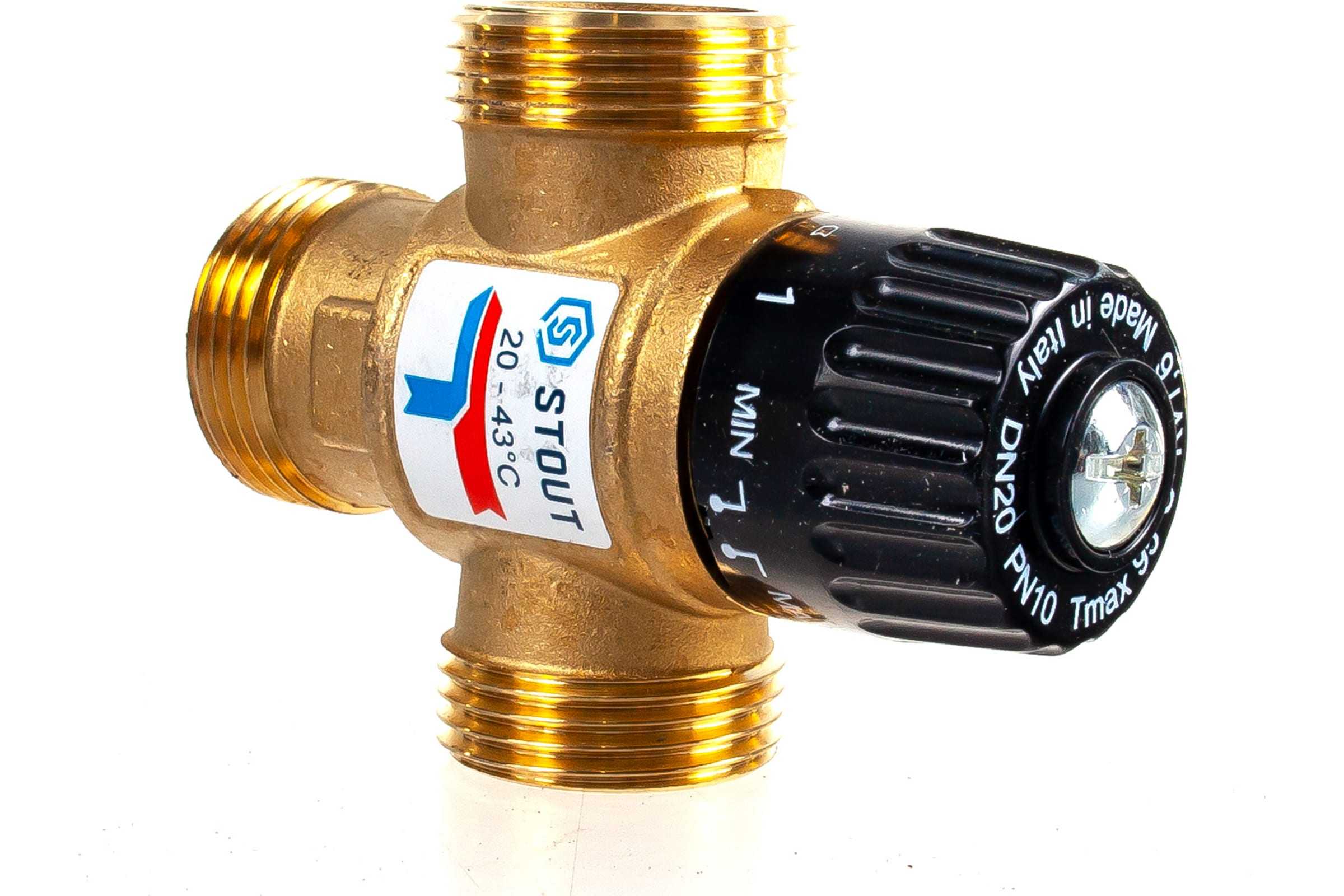 Трехходовой термостатический смесительный клапан Stout 1" НР 20-43°С KVs 1.6 (SVM-0120-164325) используется для автоматического управления температурой смеси теплоносителей в точке её выхода из клапана.