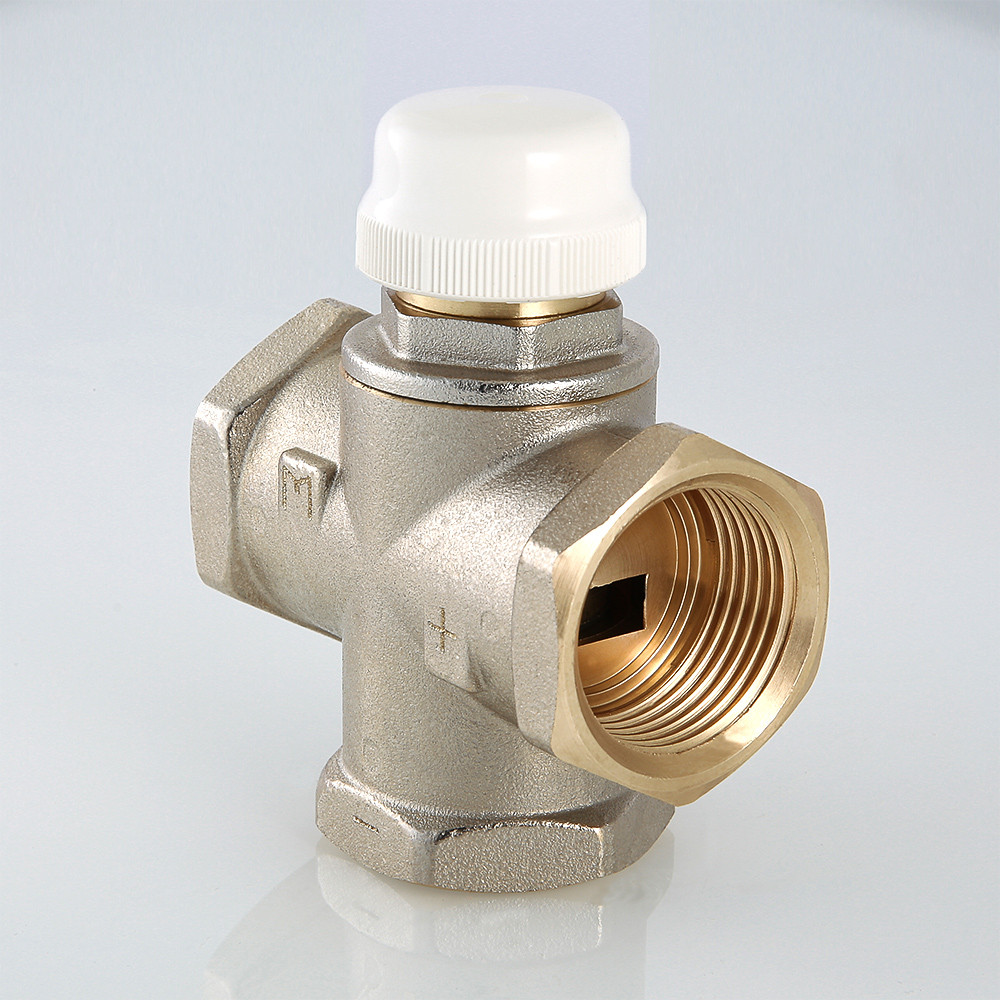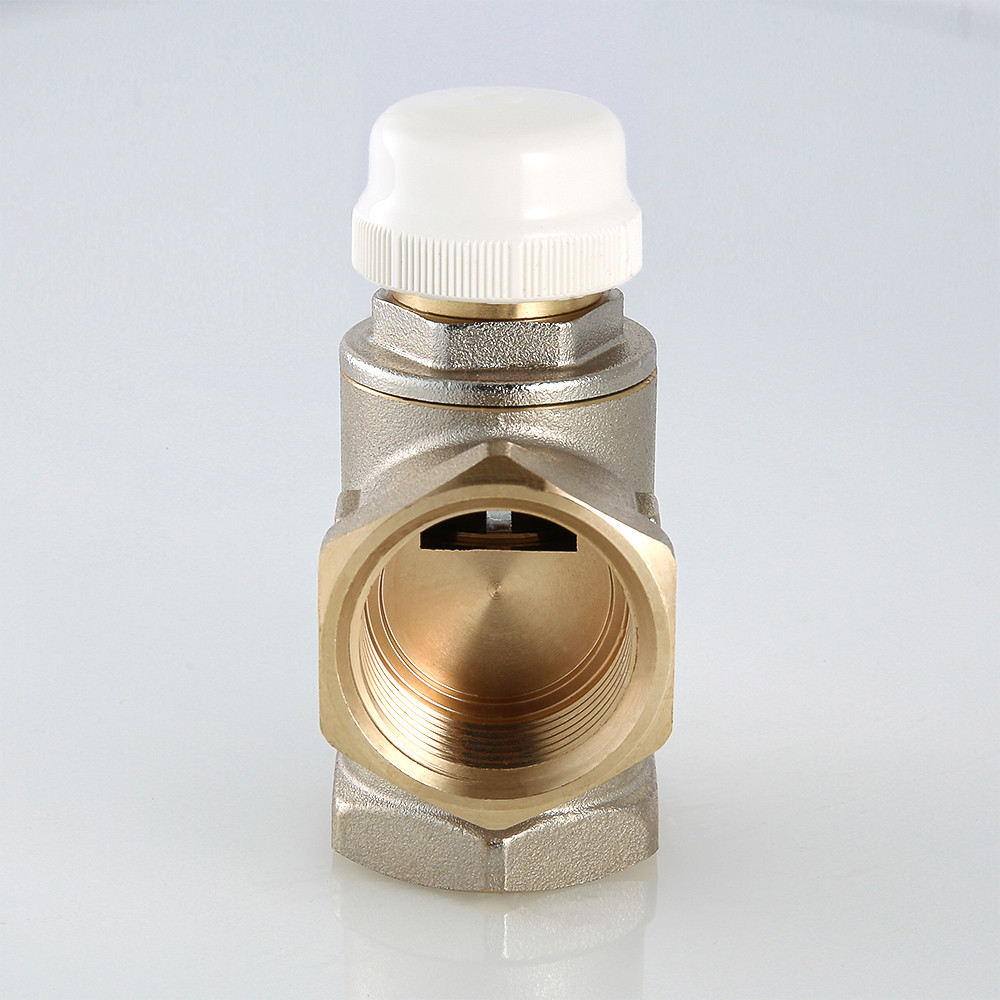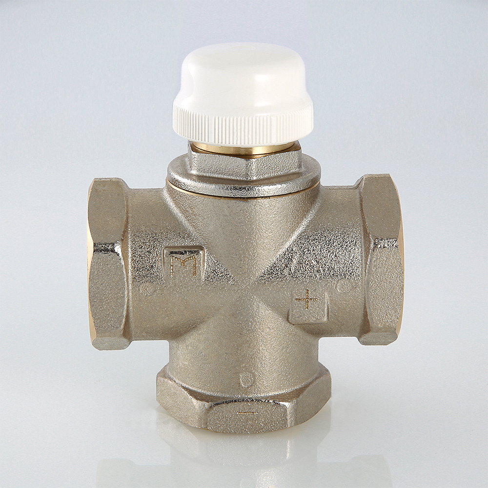 Клапан предназначен для использования в смесительных узлах гидравлических систем (байпасные узлы подмеса, узлы смешения для получения заданного уровня температуры смешанной жидкости и т.п.). Регулирование клапаном может осуществляться вручную или с помощью сервопривода. Корпус выполнен из латуни марки CW617N (европейский стандарт EN 12165), никелирован. Материал штока, основания золотника и пружины – нержавеющая сталь марки AISI 316, золотникового уплотнителя – синтетический каучук EPDM. Резьба присоединительных патрубков – внутренняя, 1". Данная модель – c боковым смешением и допускает полное перекрытие входных патрубков.