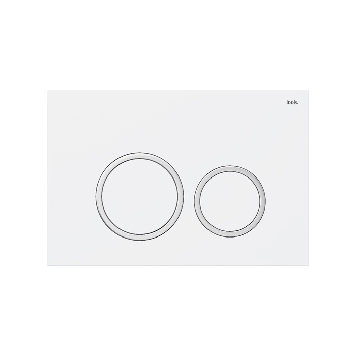 Универсальная клавиша смыва из пластика. Цвет: матовая белая основа, глянцевые хромовые кольца, матовые белые кнопки. Размер: 245х165х27,7 мм.