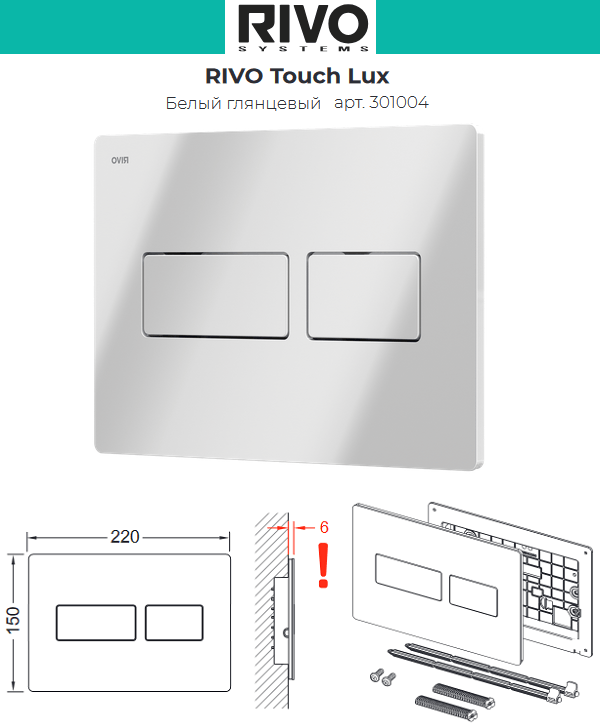 Панели двойного смыва RIVO Touch Lux изготовлены из высококачественного пластика с применением стальной панели. Строгий дизайн панели позволяет реализовывать элегантные проекты ванных комнат и помещений санитарно-технического назначения.