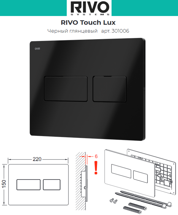 Панели двойного смыва RIVO Touch Lux изготовлены из высококачественного пластика с применением стальной панели. Строгий дизайн панели позволяет реализовывать элегантные проекты ванных комнат и помещений санитарно-технического назначения.