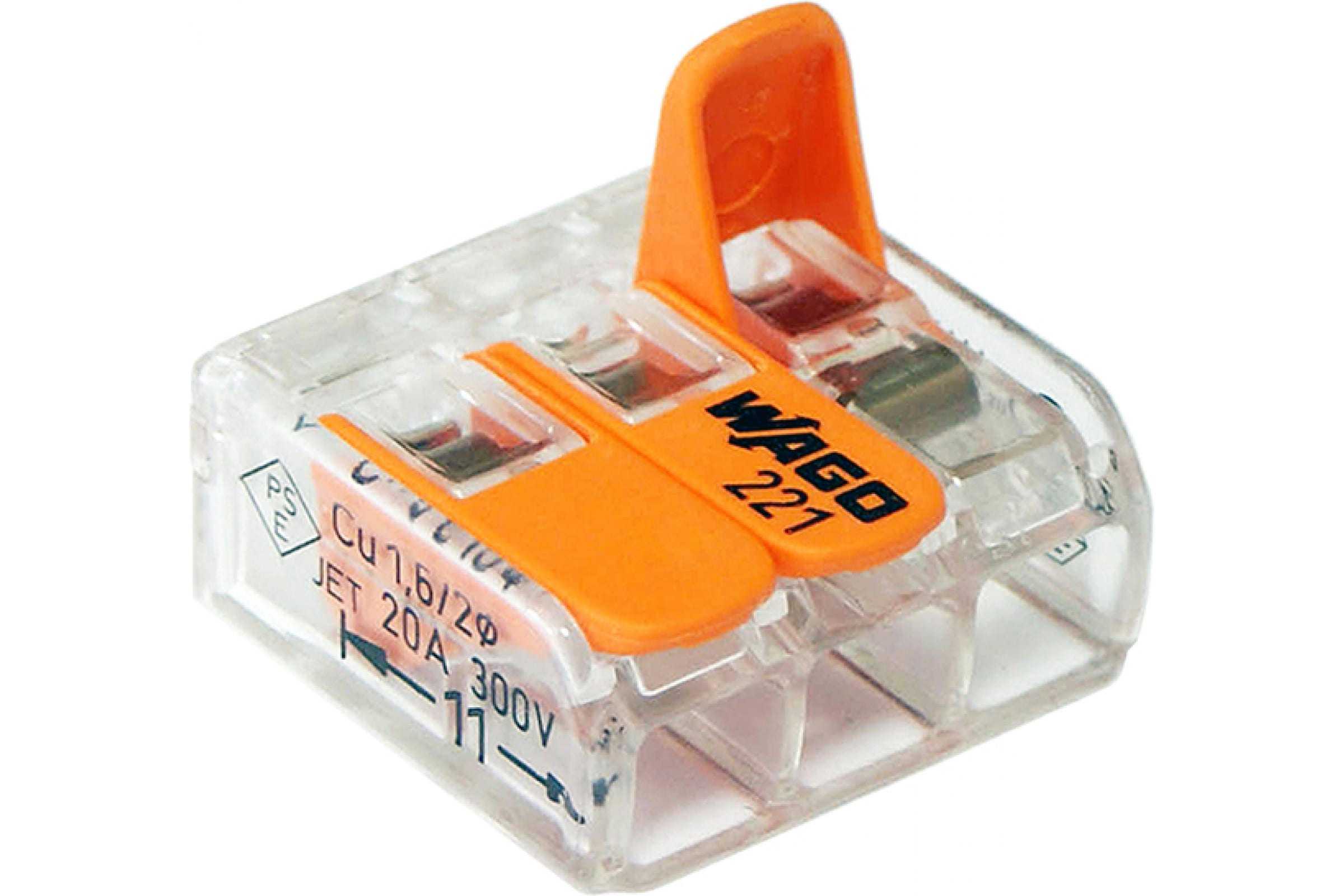 Клемма WAGO используется для соединения любых типов медных проводников моножильных и многопроволочных, а также разных сечений.