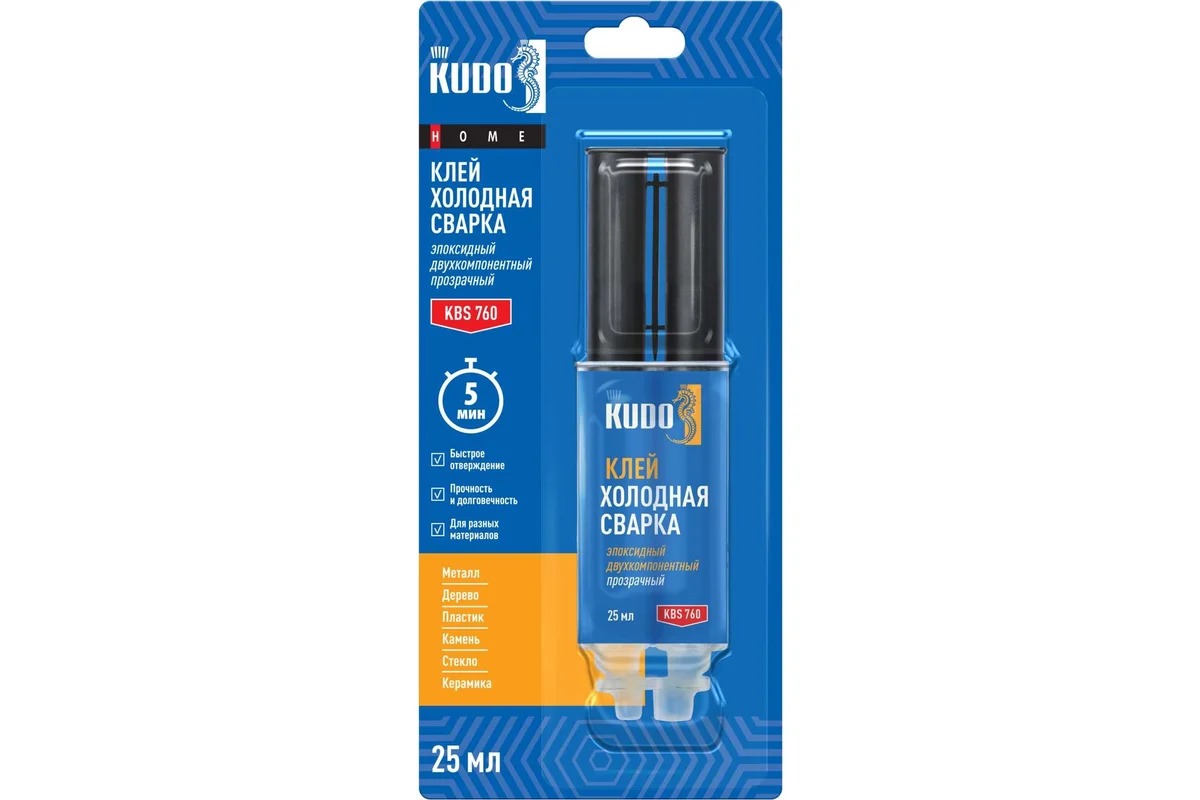 Клей эпоксидный двухкомпонентный прозрачный KUDO HOME, 25 мл KBS-760 - высококачественный эпоксидный двухкомпонентный состав быстрого отверждения предназначен для склеивания и восстановления деталей из различных материалов, таких как металл, дерево, большинство видов пластика, камень и кирпич, стекло и керамика, и другие.