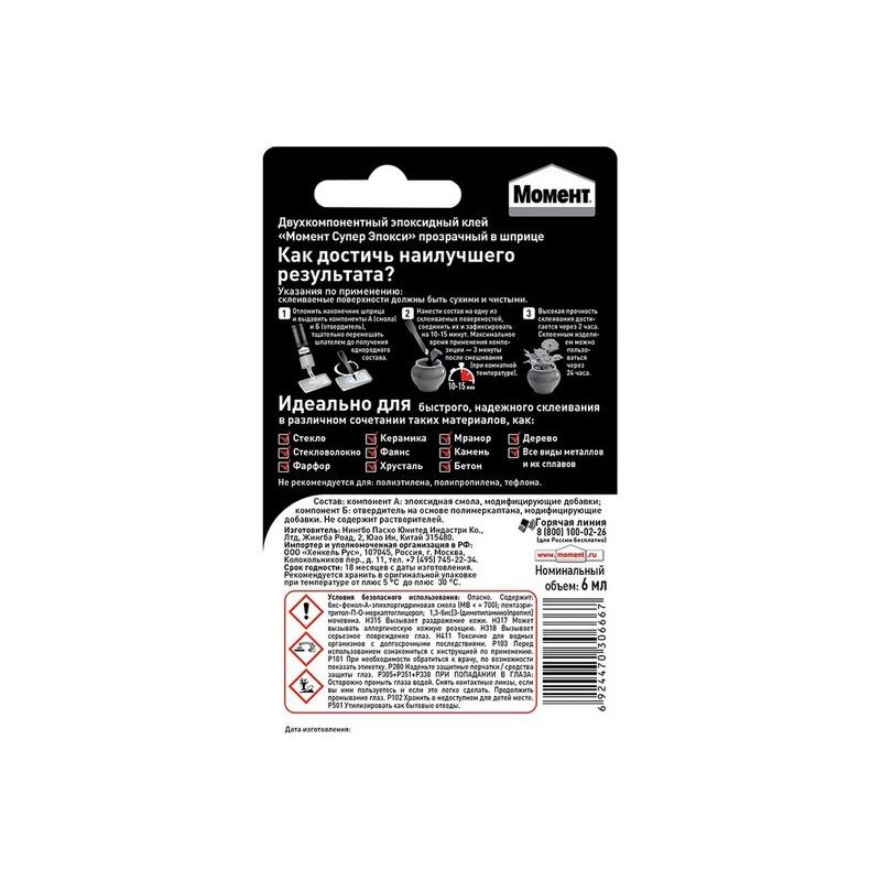 Он не расширяется и не сжимается при отверждении, устойчив к воздействию воды, масел и растворителей. После отверждения Момент Супер Эпокси можно окрашивать, полировать и даже сверлить!