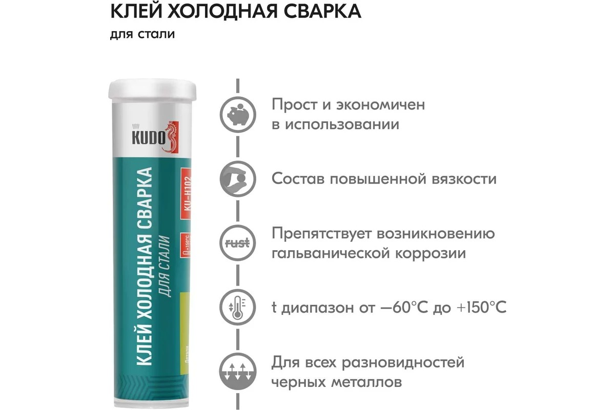 Клей для стали KUDO Холодная сварка KU-H102 предназначен для надежного склеивания, ремонта и восстановления деталей из металла. Незаменим для автослесарных работ, ремонта инструмента, сантехники, труб водоснабжения.