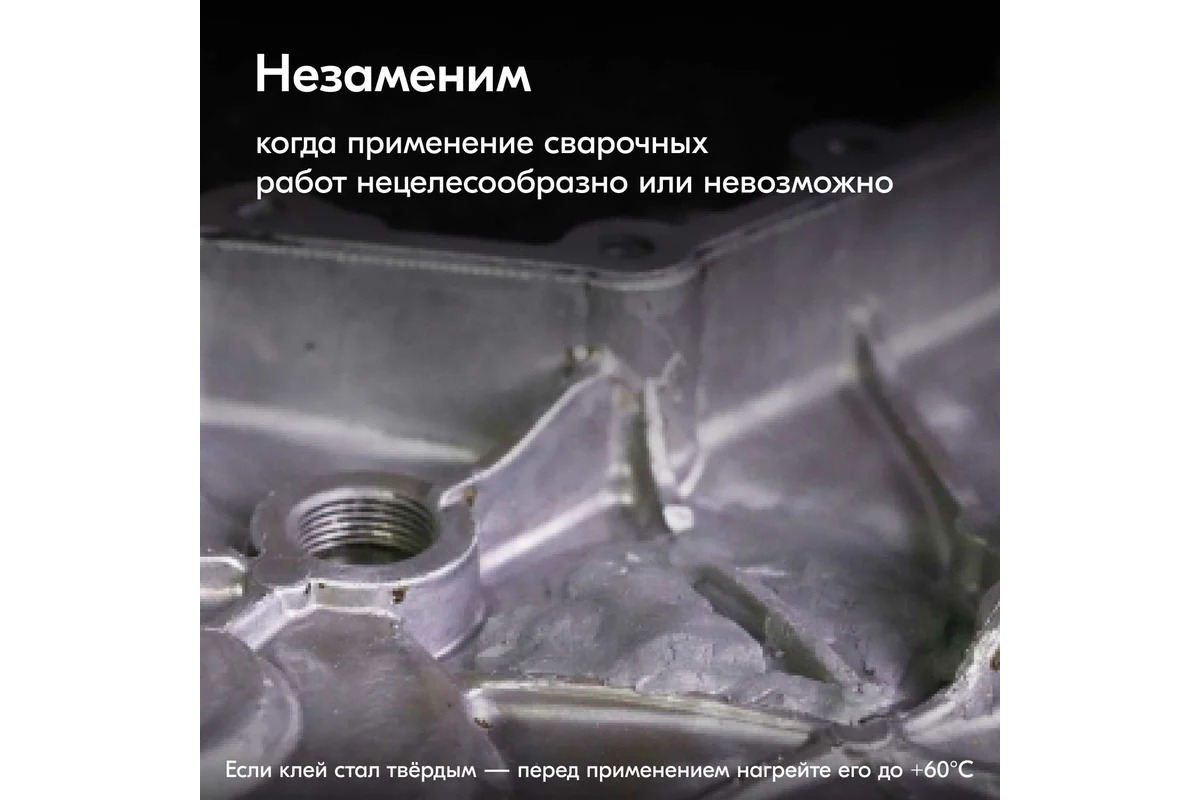Устойчив к воздействию воды, антифриза, масел и других технических жидкостей. Температурный диапазон эксплуатации отремонтированного изделия от -60°C до +250°C. Клей прост и экономичен в использовании.