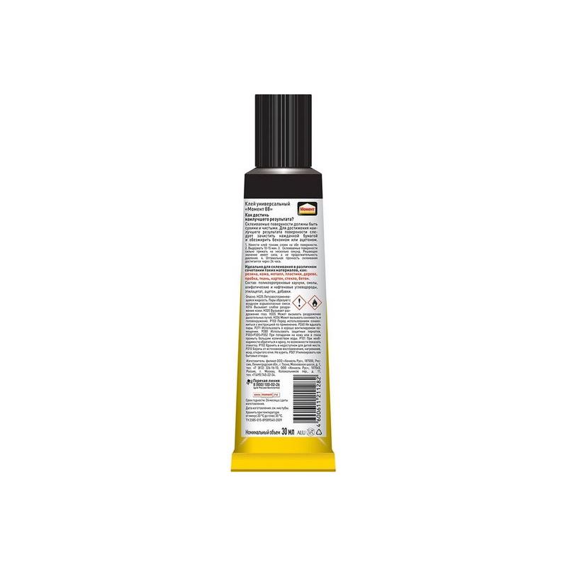 Клей Момент 1139012 имеет гелеобразную консистенцию. Такой клей легко наносить, он не растекается и не капает с вертикальных поверхностей. Применяют для комбинационного склеивания мягкого и жесткого ПВХ, полистирола, оргстекла и других пластиков, дерева, резины, кожи, пробки, ткани, поролона, бумаги, картона, стекла, фарфора, керамики, вспененных материалов, металлов и многих других материалов. Нельзя использовать при склеивании посуды, контактирующей с пищей, а также стиропора, полиэтилена и полипропилена. Необходимо хранить при температуре о -20?С до +30?С.