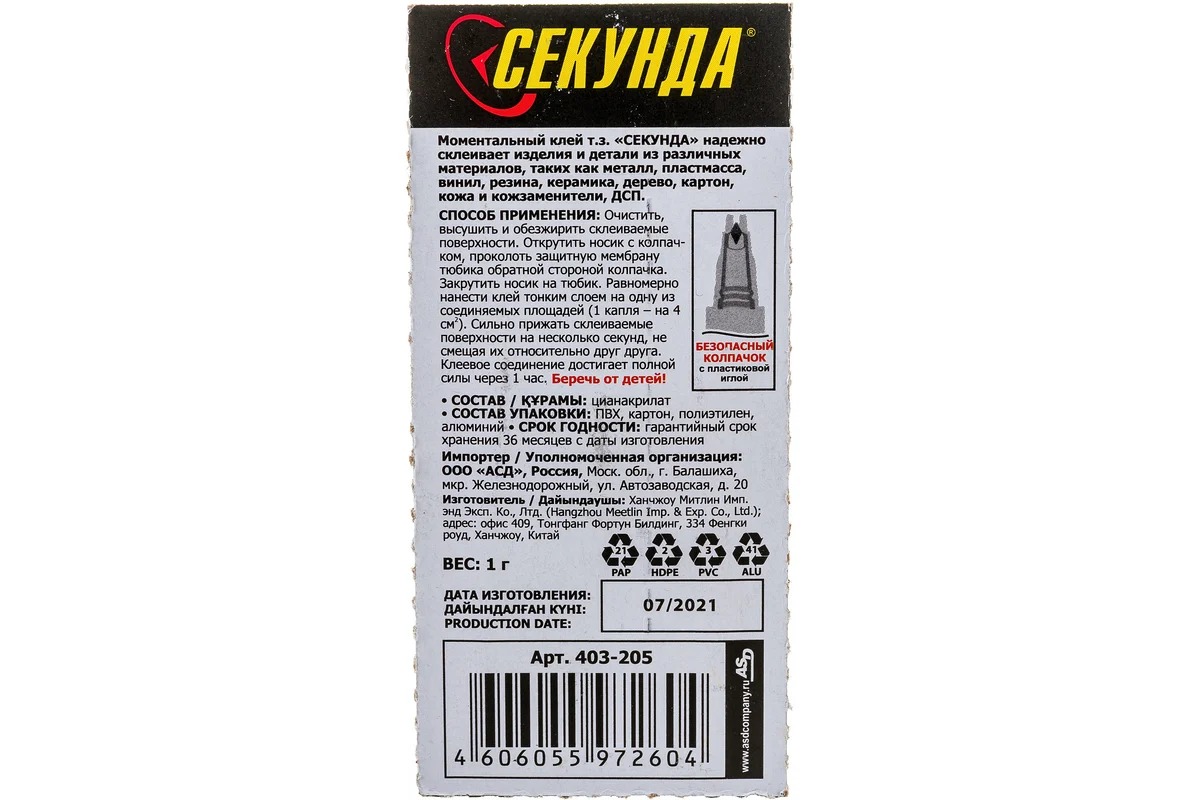 Моментальный клей Секунда 1 г, блистер мини-карт на листе 403-205 подойдет для склеивания различных материалов: пластмасса, резина, металл, дерево, фарфор, керамика, кожа, пробка, ткань, картон.