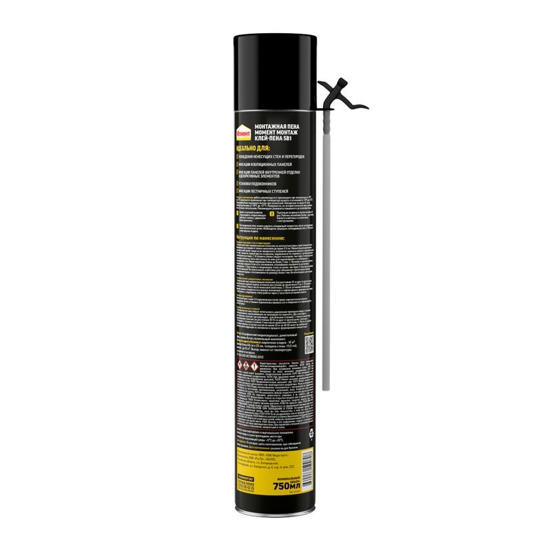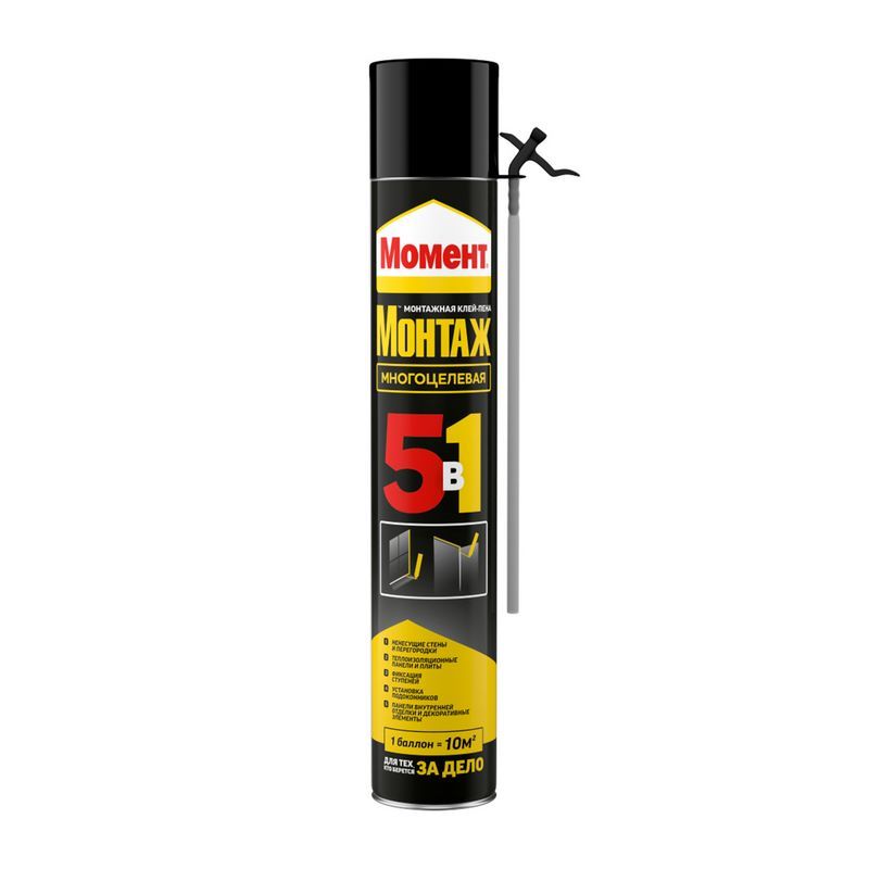 Момент Монтаж 5в1 клей-пена с трубочкой-аппликатором — это готовая к употреблению твердеющая под воздействием влаги сверхэффективная универсальная полиуретановая расширяющаяся клей-пена. Превосходная адгезия к различным поверхностям таким как дерево, бетон, камень, металл и т.д. в сочетании с небольшой заполняющей способностью делает клей-пену особенно подходящей для неровных поверхностей.