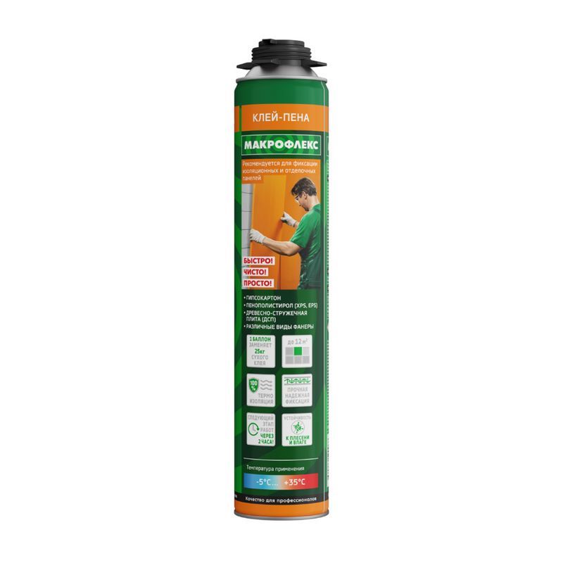 Однокомпонентная аэрозольная полиуретановая клей-пена для соединения и крепления строительных материалов. Позволяет выполнить работу значительно меньшими усилиями и помогает вдвое сократить затрачиваемое на работу время