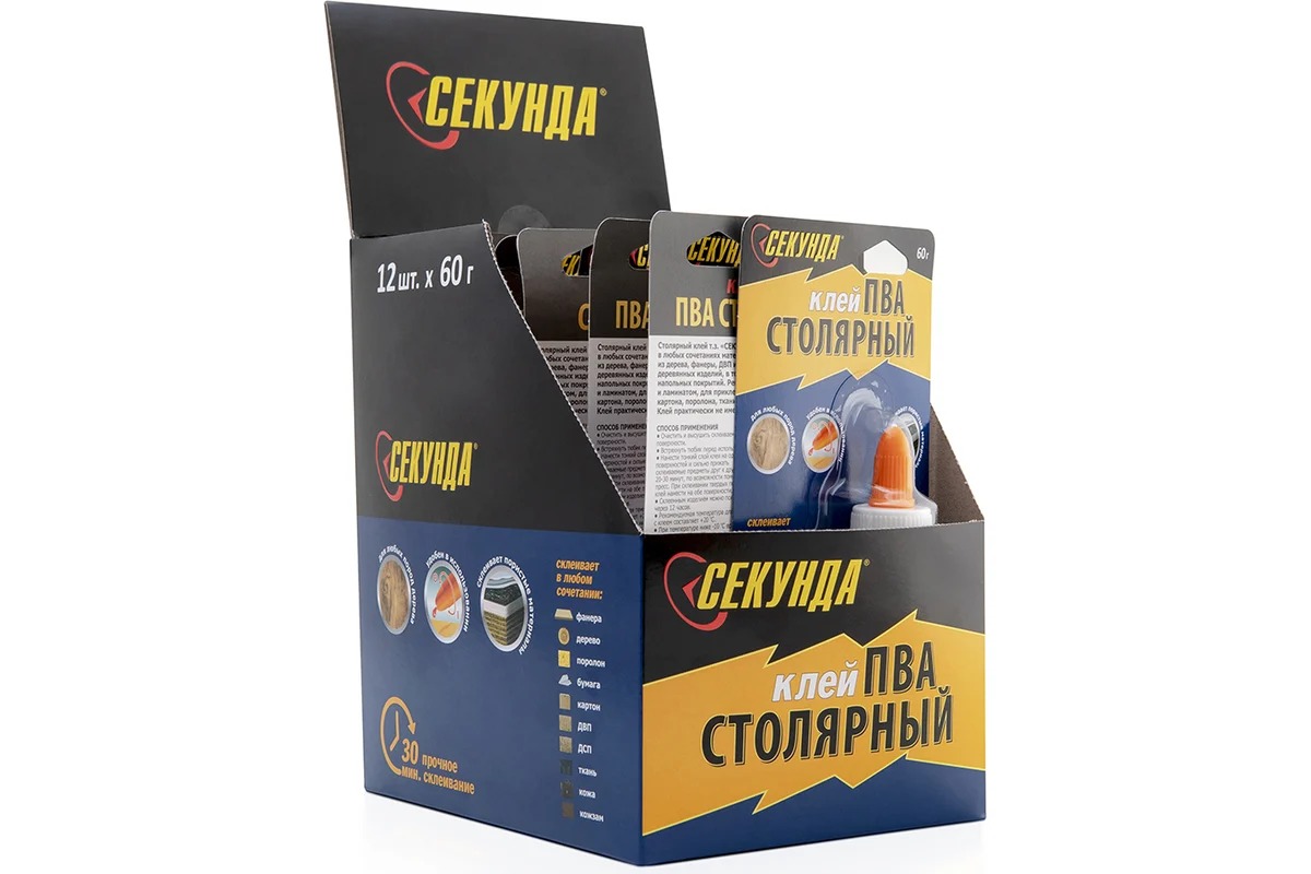 Столярный клей Секунда 60г, в индивидуальном блистере 403-073 имеет удобный для использования тюбик.
