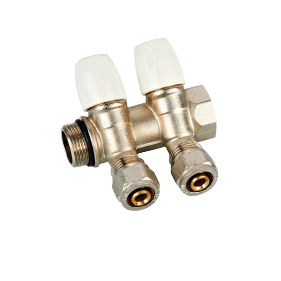 Коллектор 2 отв. регулируемый 3/4"*1/2(16) с адаптерами Vieir (никель, белые ручки) (VR512)