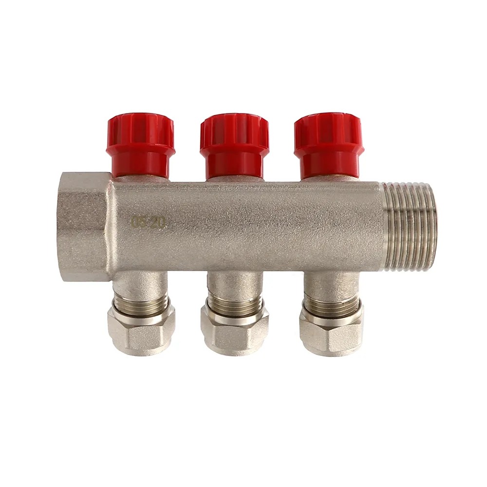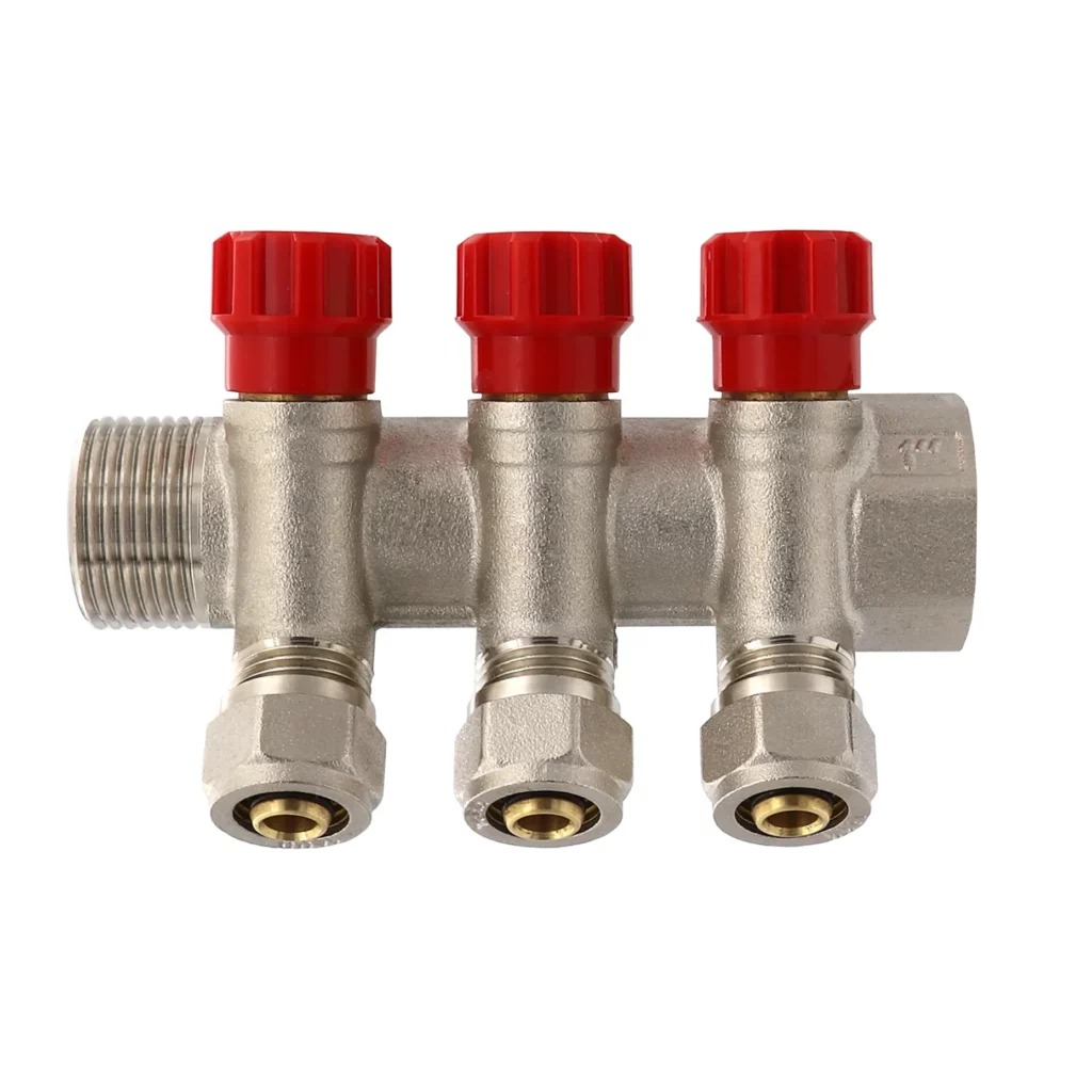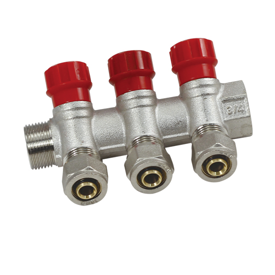 Коллектор 3 отв. регулируемый 3/4"*1/2(16) с адаптерами Vieir (никель, красные ручки) (VR503)