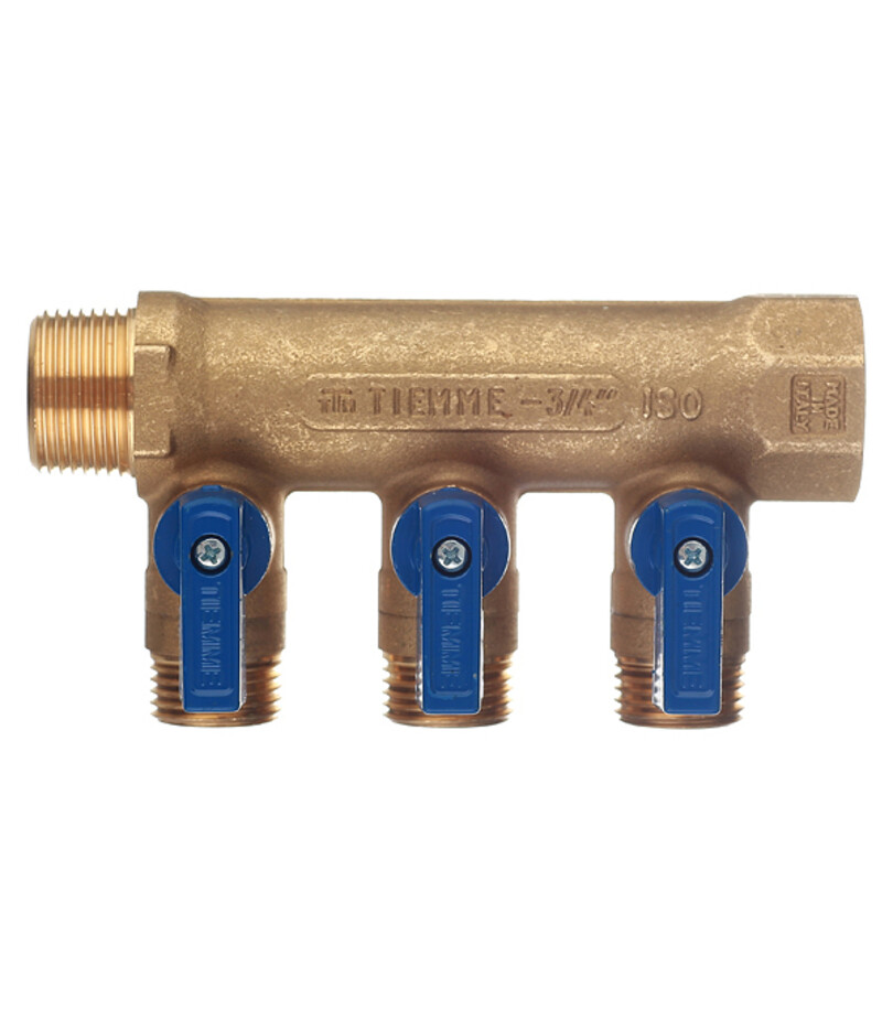 Коллектор 3 отв. с шар. клапанами Tiemme 3/4"*1/2"(16) (латунь) синие ручки (1820035)