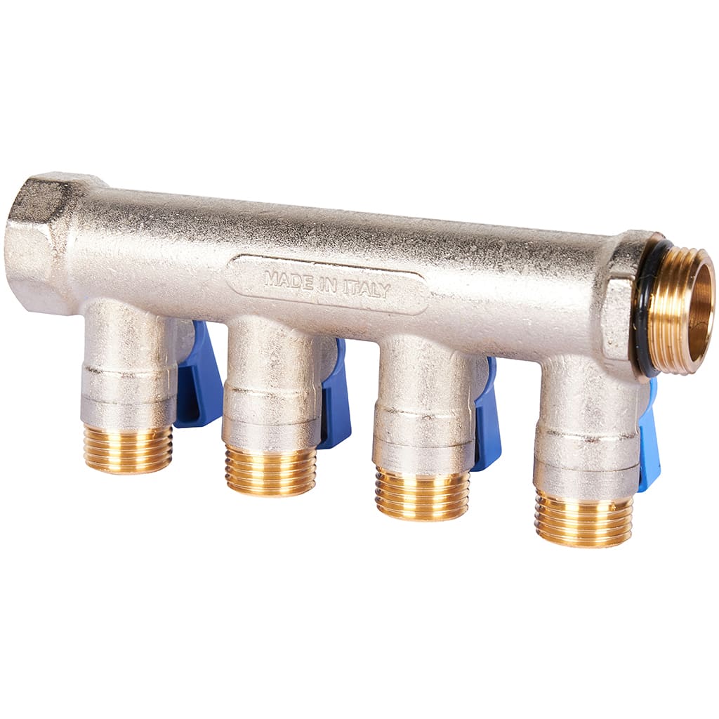 Коллектор 4 отвода с шаровыми клапанами 3/4"x1/2"(16) Stout (никель, синие ручки) (SMB-6211-341204)