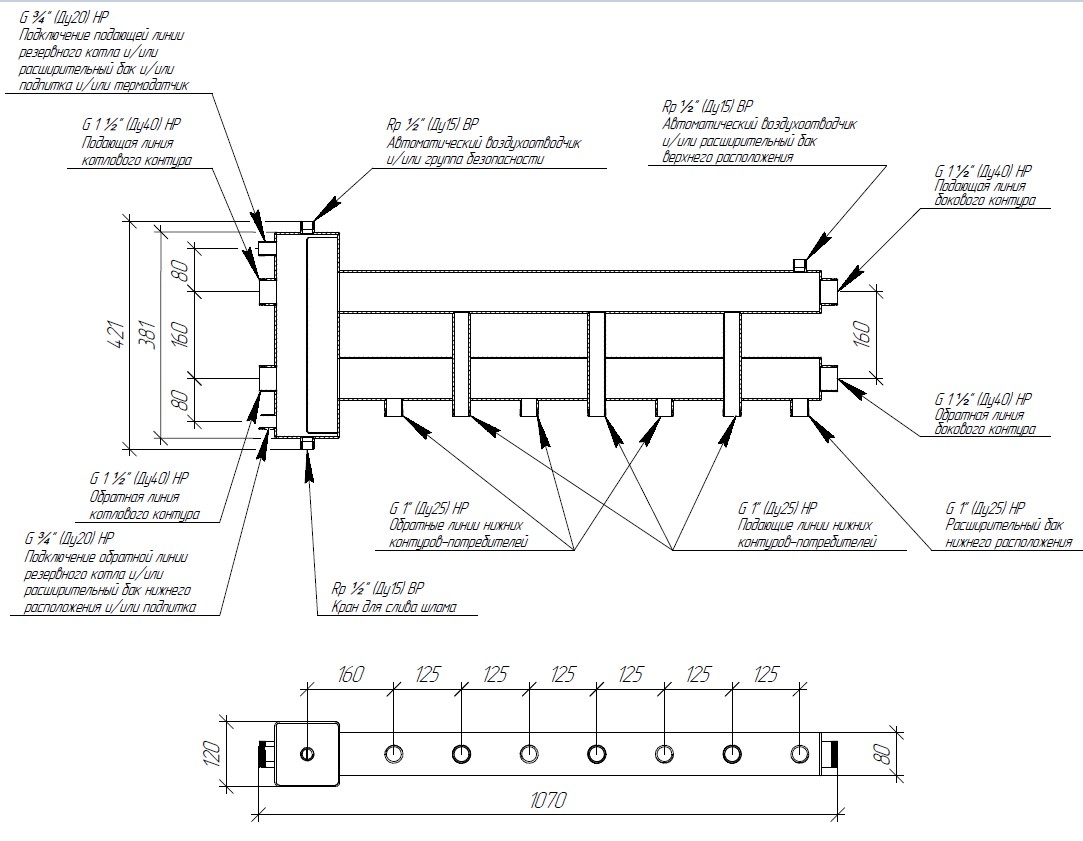 Коллектор с гидрострелкой (балансировочный коллектор) применяется в системах отопления до 1200 м2 для соединения одного или нескольких котлов с четырьмя потребителями (в конфигурации 3+1).