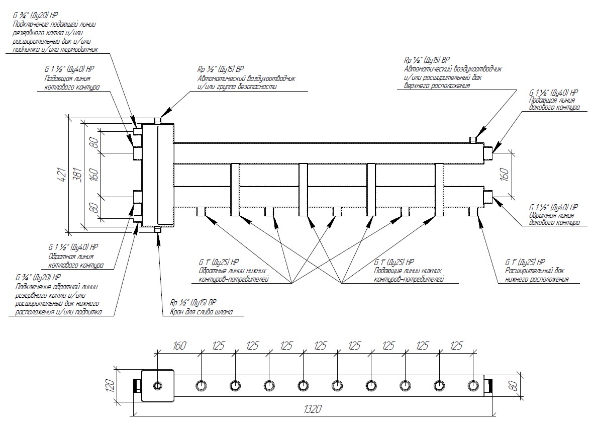 Коллектор с гидрострелкой (балансировочный коллектор) применяется в системах отопления до 1200 м2 для соединения одного или нескольких котлов с пятью потребителями (в конфигурации 4+1).
