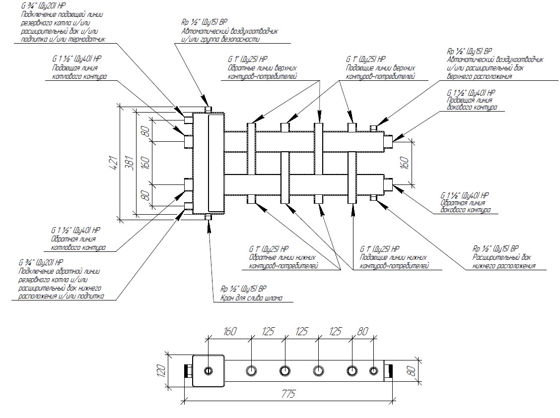 Встроенный нержавеющий сепаратор в виде поперечной полноразмерной перфорированной пластины засчет завихрения потока самого воздухо-насыщенного теплоносителя из подающей линии котла, обеспечит эффективное всплытие пузырьков воздуха с последующим их отведением через верхний штуцер гидрострелки и подключенного к нему автоматического воздухоотводчика.