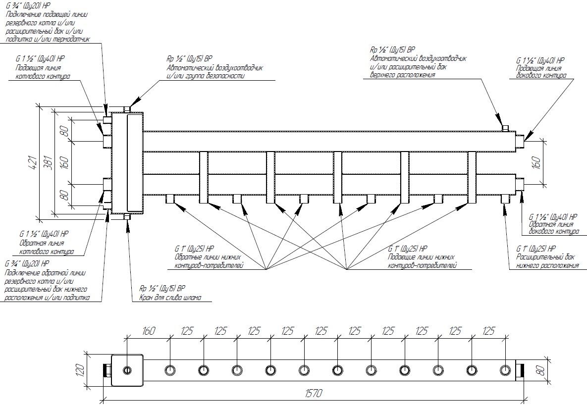 Коллектор с гидрострелкой (балансировочный коллектор) применяется в системах отопления до 1200 м2 для соединения одного или нескольких котлов с шестью потребителями в конфигурации 5+1.