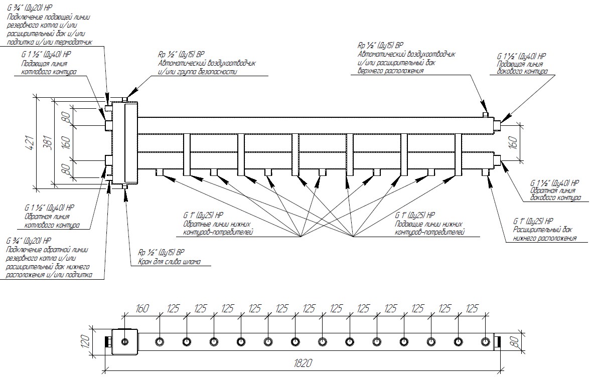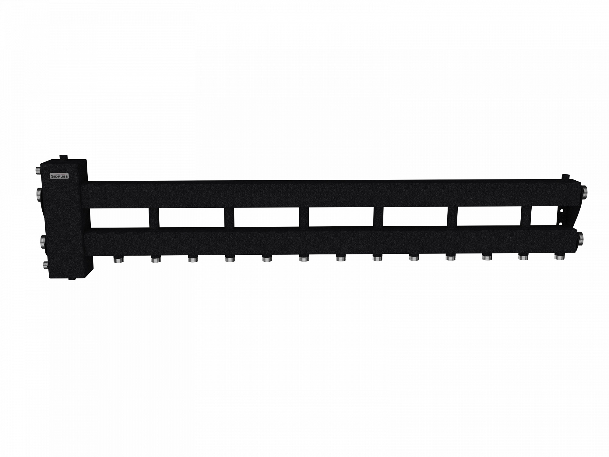Коллектор с гидрострелкой (балансировочный коллектор) применяется в системах отопления до 1200 м2 для соединения одного или нескольких котлов с семью потребителями в конфигурации 6+1.