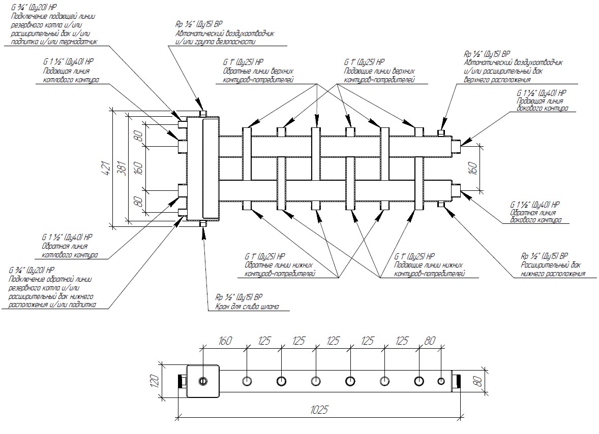 Коллектор с гидрострелкой (балансировочный коллектор) применяется в системах отопления до 1200 м2 для соединения одного или нескольких котлов с 7 потребителями в конфигурации 3+3+1.