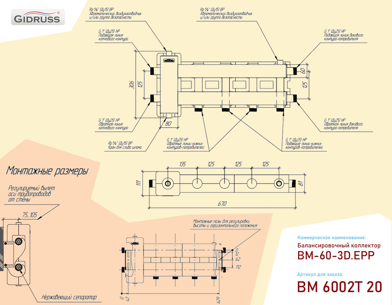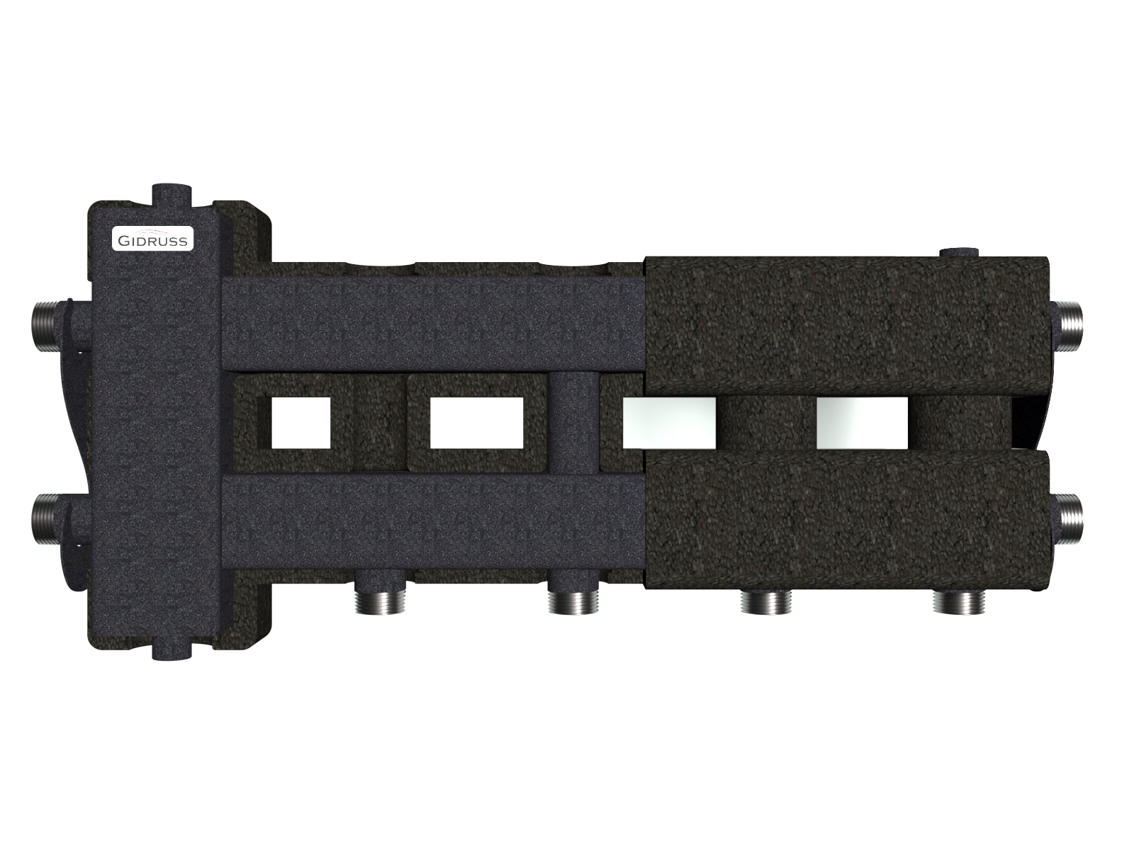 Коллектор балансировочный Gidruss BM-60-3D.EPP (до 60 кВт, подкл. котла G 1", 2+1 контура G 1", 4D-кронштейны K.UMS, EPP-термоизоляция, ст. 09Г2С)
