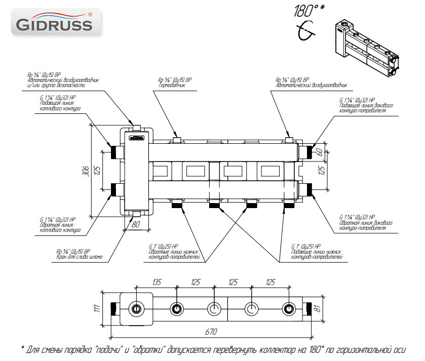 Коллектор балансировочный Gidruss BM-80-3DU.EPP (до 80 кВт, подкл. котла G 1 1/4", 1+1 контура G 1", боковой контур G 1 1/4", 4D-кронштейны K.UMS, EPP