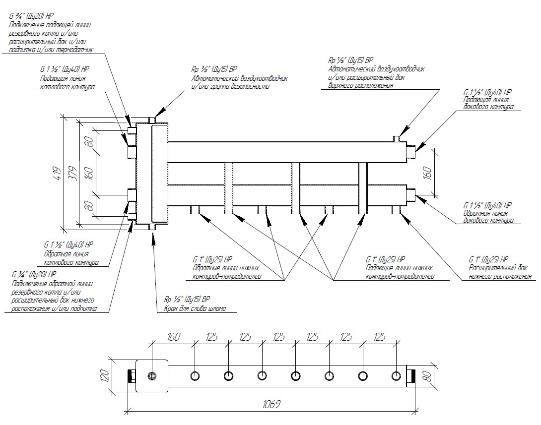 Гидроразделитель разделитель с коллектором (балансировочный коллектор) применяется в системах отопления до 1200 м2 для соединения одного или нескольких котлов с четырьмя потребителями (в конфигурации 3+1).