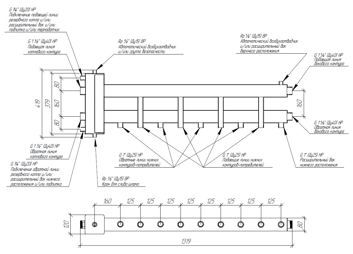 Коллектор с гидрострелкой (балансировочный коллектор) применяется в системах отопления до 1200 м2 для соединения одного или нескольких котлов с пятью потребителями (в конфигурации 4+1).
